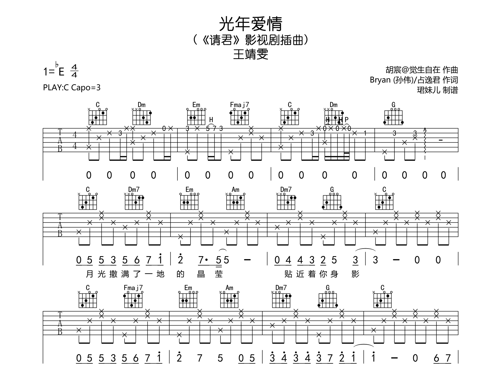 曲谱介绍: 《光年爱情》吉他谱,王靖雯演唱(《请君》影视剧插曲),《光年爱情》吉他弹唱谱,由珺妹儿制谱,本谱采用C调指法编配,变调夹3品,速度85BPM,难度较简单,易上手。共有2张高清图片谱例。