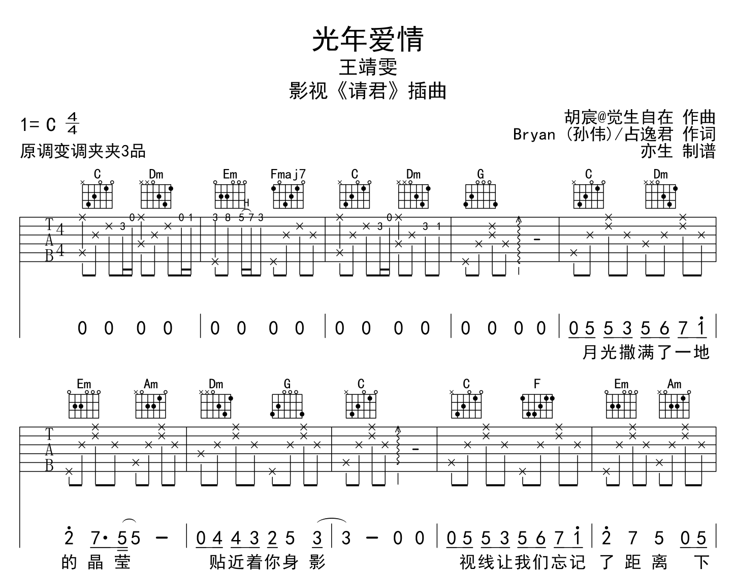 曲谱介绍: 《光年爱情》吉他谱,王靖雯演唱(《请君》影视剧插曲),《光年爱情》吉他弹唱谱,由@亦生编配制谱,本谱采用C调指法编配,变调夹3品弹唱原调bE,速度95BPM,难度较简单,易上手。共有2张高清图片谱例。