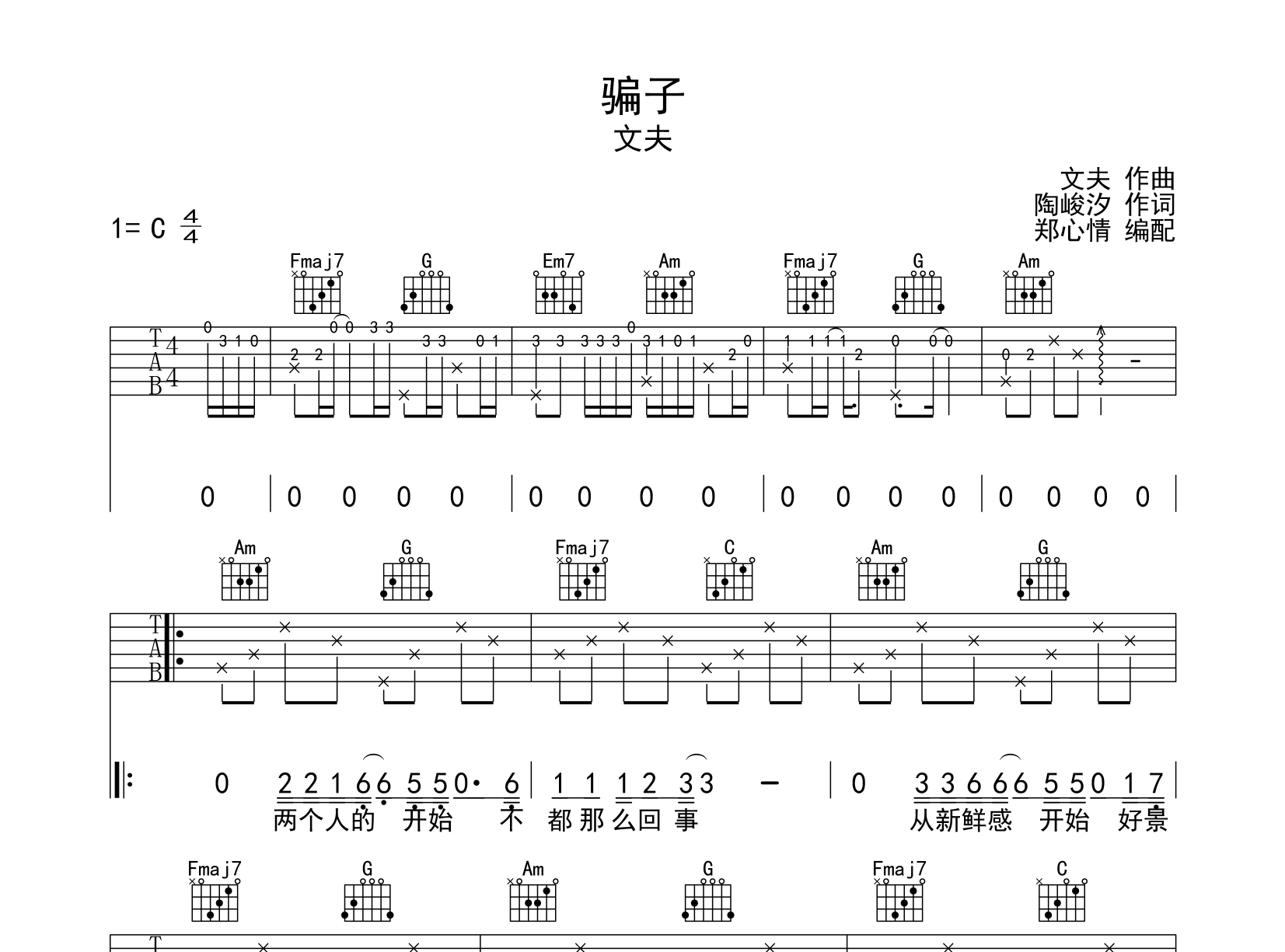 曲谱介绍: 骗子吉他谱,文夫演唱,《骗子》吉他弹唱谱,来自@郑心情编配扒谱制作,本吉他谱采用C调和弦指法编配,可以根据个人嗓音条件灵活选择变调夹位置,演奏的速度控制在每分钟68拍左右,演奏难度简单,共有3张高清图片谱例。