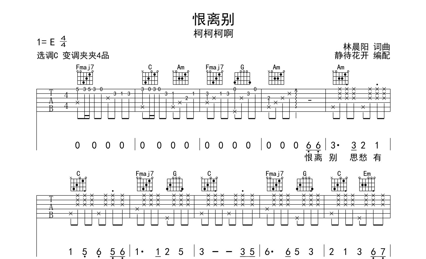 曲谱介绍: 恨离别吉他谱,柯柯柯啊演唱,《恨离别》吉他弹唱谱,来自@静待花开编配扒谱制作,本吉他谱采用C调和弦指法编配,推荐变调夹夹第4品演奏,原调E调,也可以根据个人嗓音条件灵活选择变调夹位置,演奏的速度控制在每分钟80拍左右,演奏难度简单