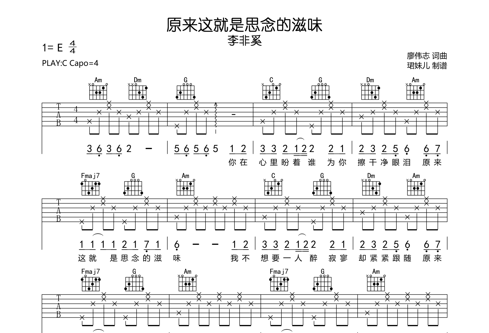曲谱介绍: 《原来这就是思念的滋味》吉他谱,李非奚演唱,《原来这就是思念的滋味》吉他弹唱谱,由@珺妹儿制谱,本吉他谱采用C调指法编配,变调夹4品,速度85BPM,难度较简单,易上手,共有2张高清图片谱例。