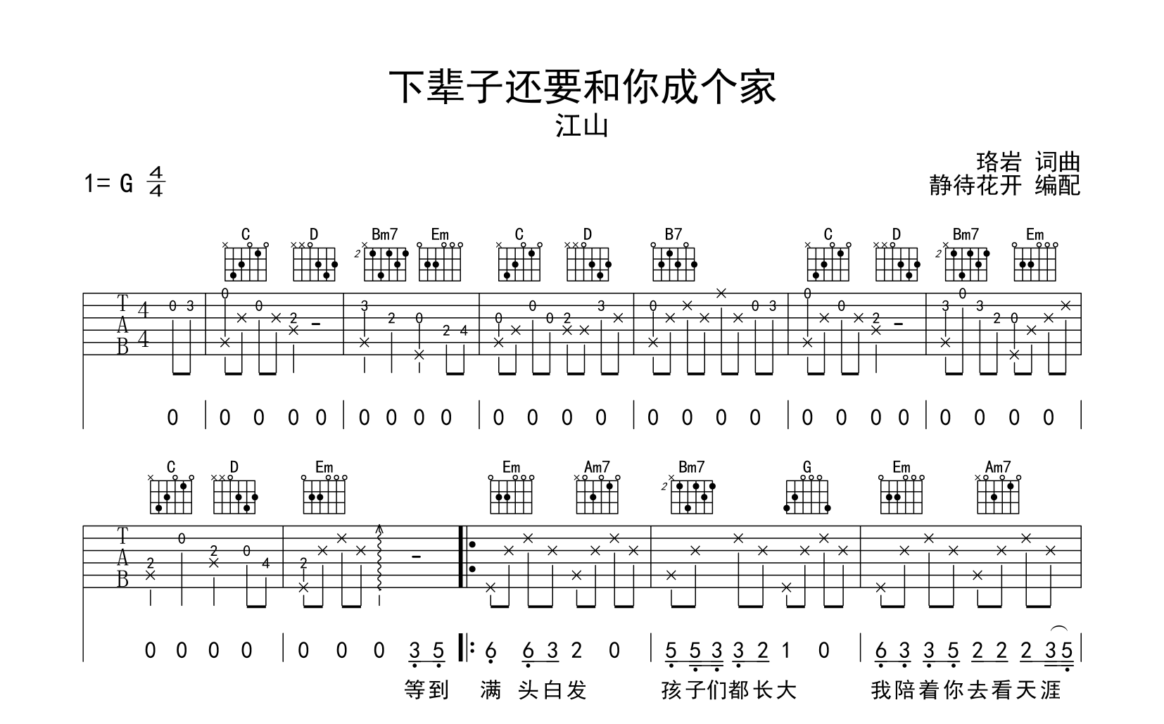 曲谱介绍: 《下辈子还要和你成个家》吉他谱,江山演唱的歌曲,《下辈子还要和你成个家》吉他弹唱谱,来自@静待花开编配扒谱制作,本吉他谱采用G调和弦指法编配,演奏不夹变调夹,原调G调,也可以根据个人嗓音条件灵活选择变调夹位置,演奏的速度控制在每分钟75拍左右,演奏难度简单。