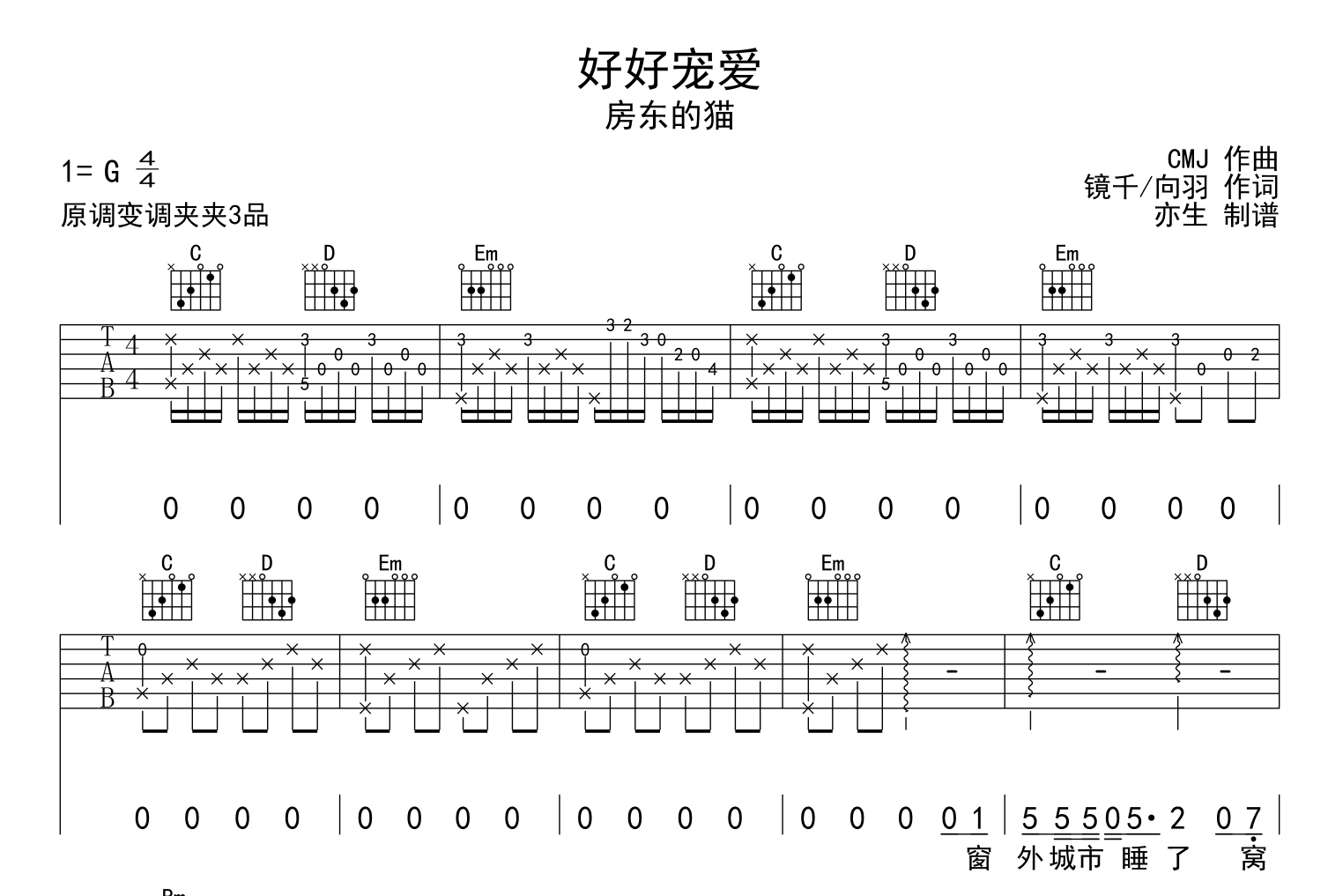曲谱介绍: 《好好宠爱》吉他谱,房东的猫演唱的歌曲,《好好宠爱》吉他弹唱谱,来自@亦生编配扒谱制作,本吉他谱采用G调和弦指法编配,CAPO夹3品弹唱原调bB,也可以根据个人嗓音条件灵活选择变调夹位置,演奏的速度控制在每分钟80拍左右,演奏难度简单。共2张高清图片谱例。