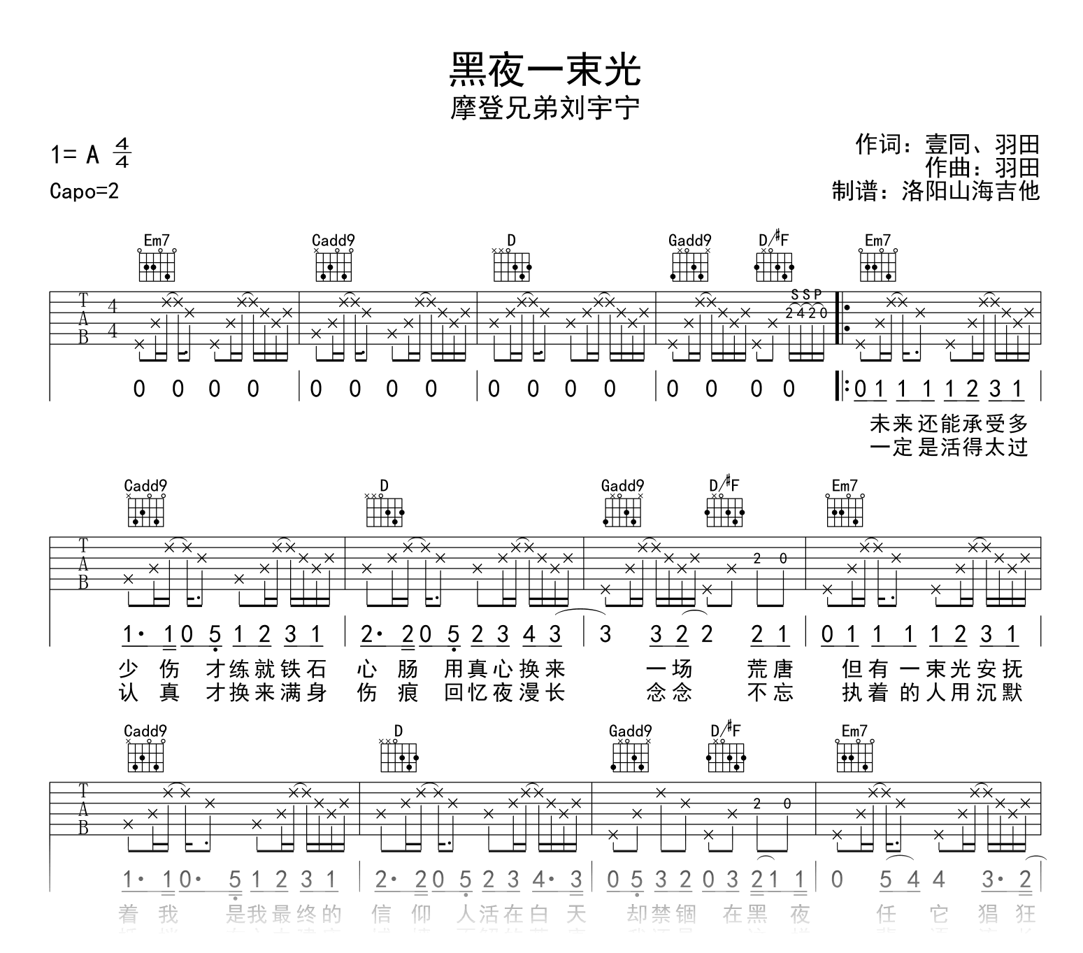 黑夜一束光吉他谱 - 摩登兄弟刘宇宁 - 吉他弹唱谱