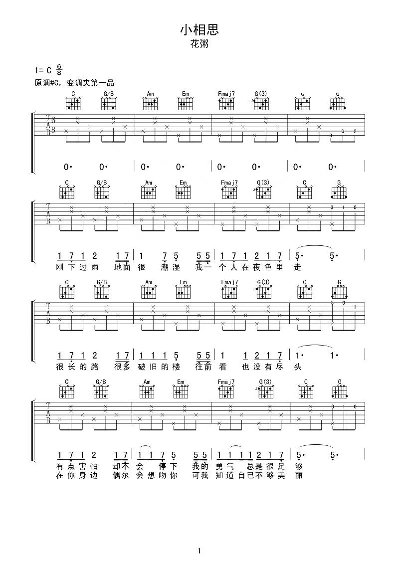 小相思吉他谱 - 花粥 - C调吉他弹唱谱