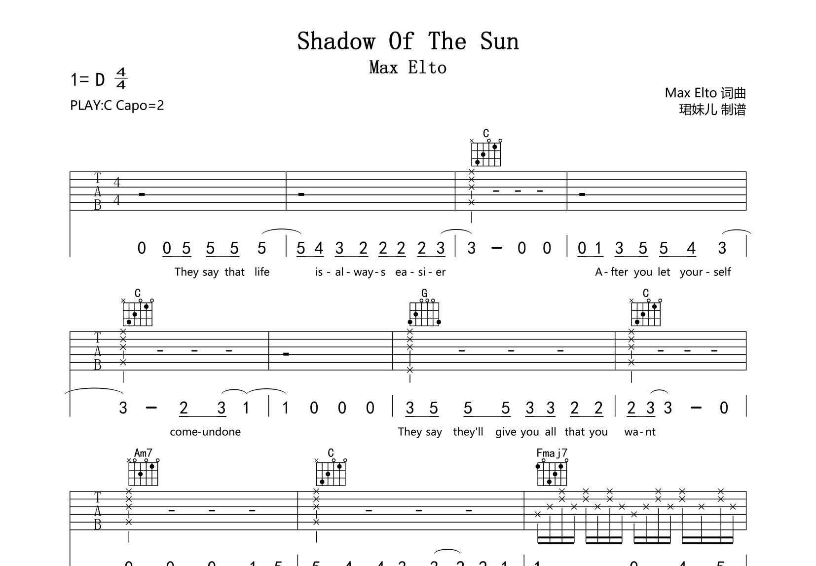 曲谱介绍: Shadow Of The Sun吉他谱,Max Elto演唱,《Shadow Of The Sun》吉他弹唱谱,本谱采用C调指法编配,弹唱建议变调夹2品,速度75BPM难度较简单,易上手。