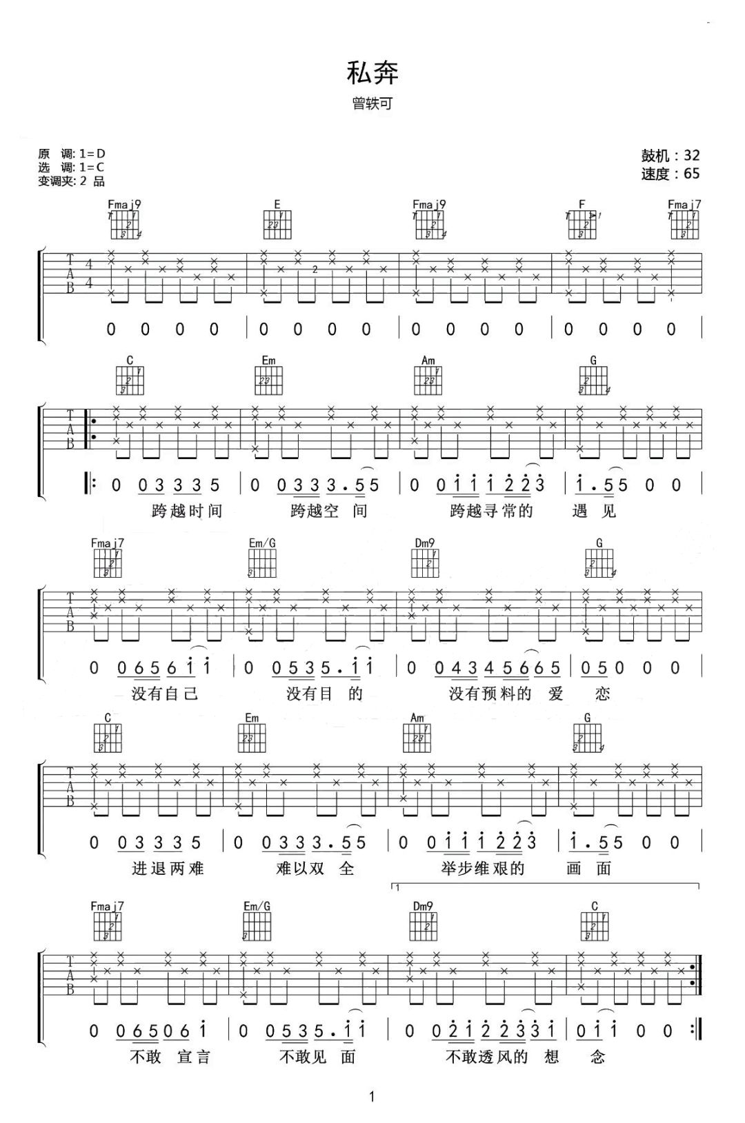 私奔吉他谱 - 曾轶可 - C调吉他弹唱谱