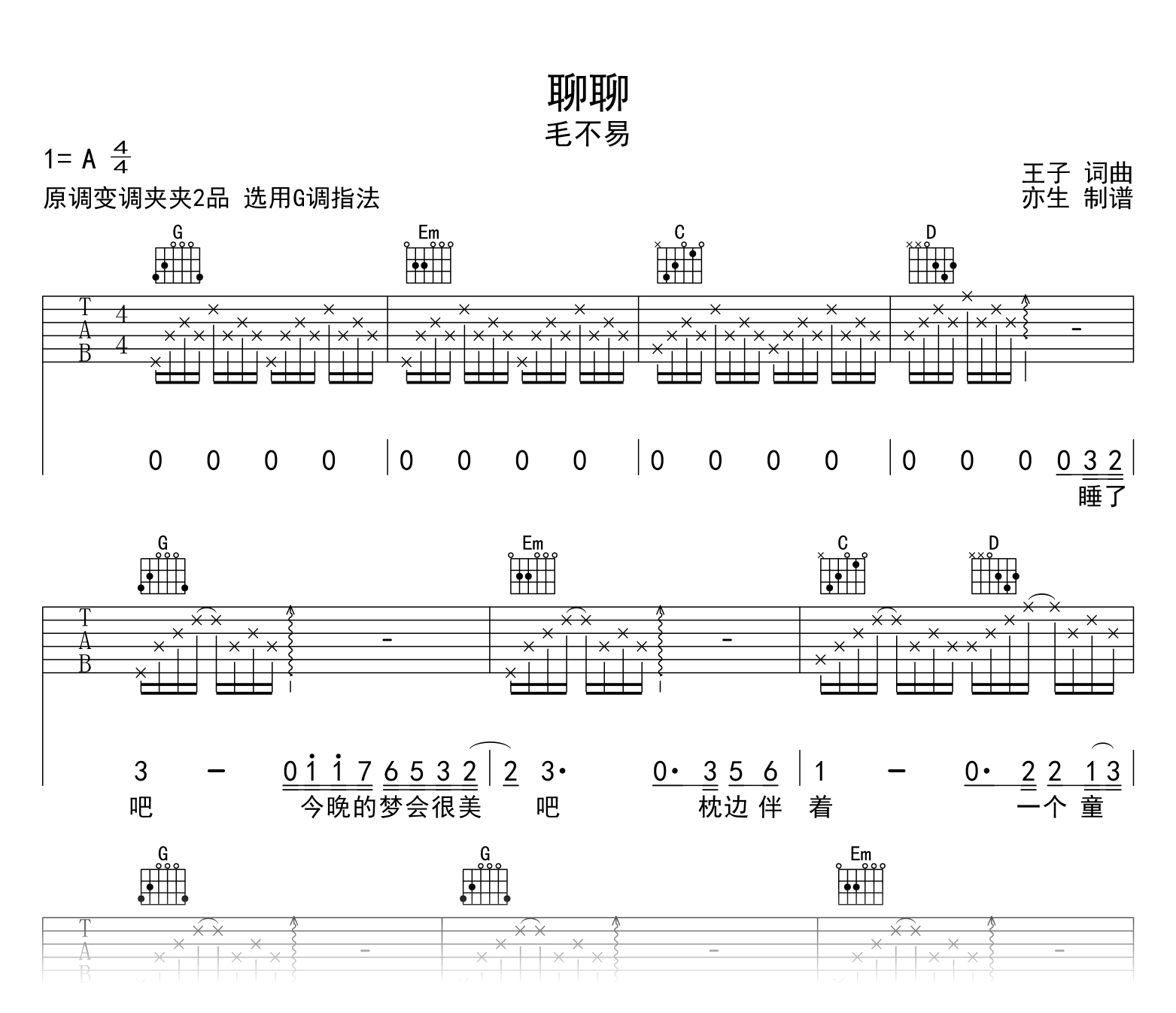 聊聊吉他谱 - 毛不易 - G调吉他弹唱谱