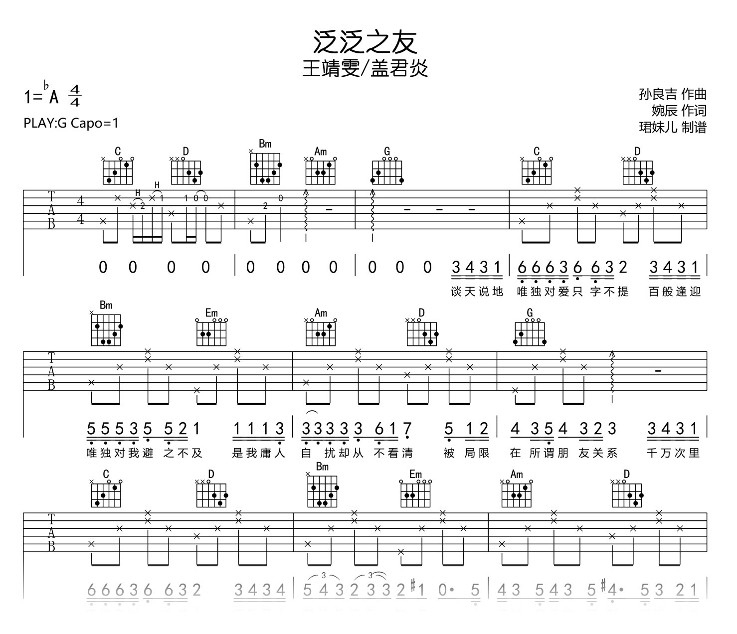 曲谱介绍: 泛泛之友吉他谱,王靖雯/盖君炎的一首合唱,《泛泛之友》吉他弹唱谱,原调bA,采用G调指法编配,弹唱建议变调夹一品,速度85BPM,演奏较简单易上手,共三张高清图片六线谱。