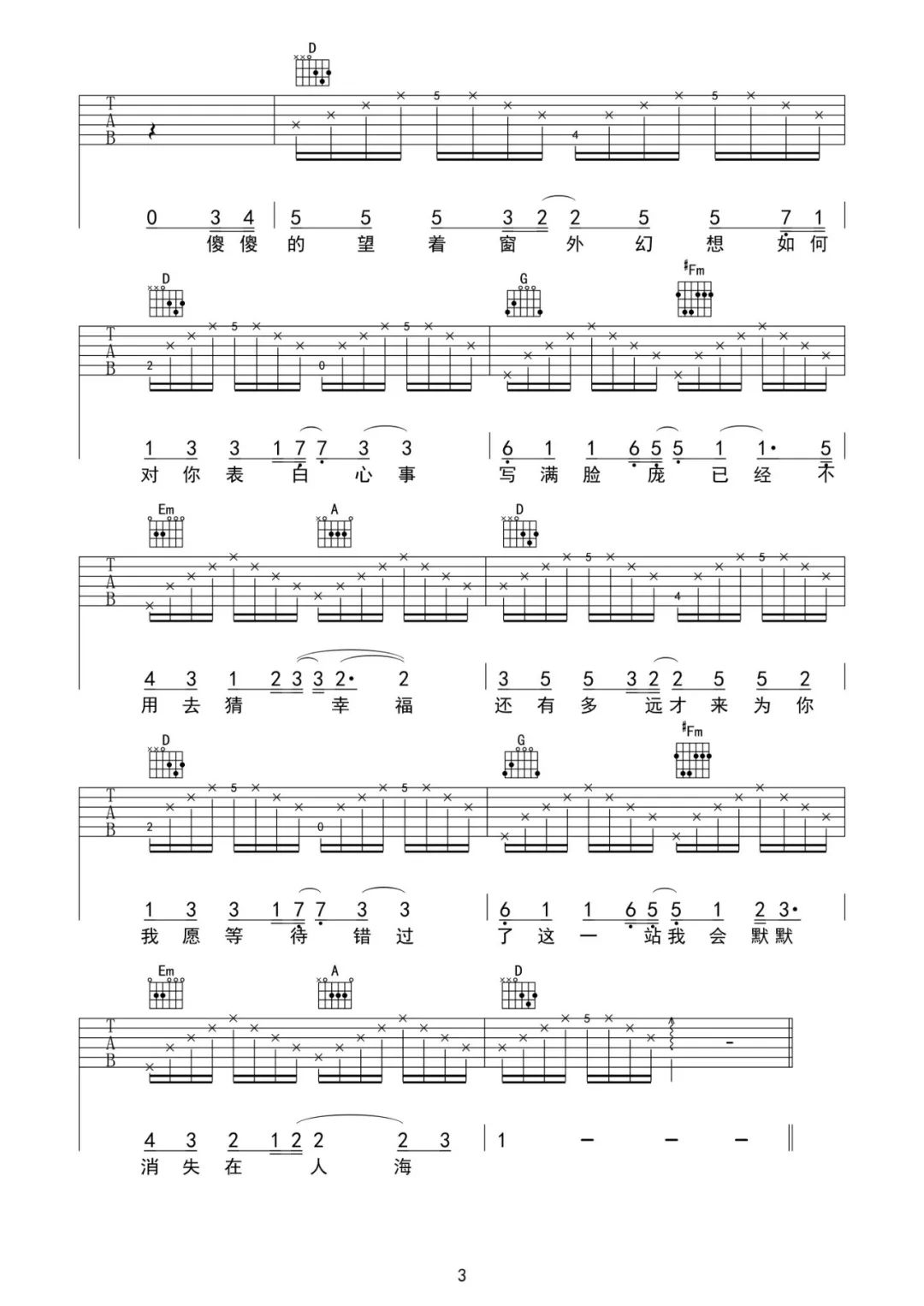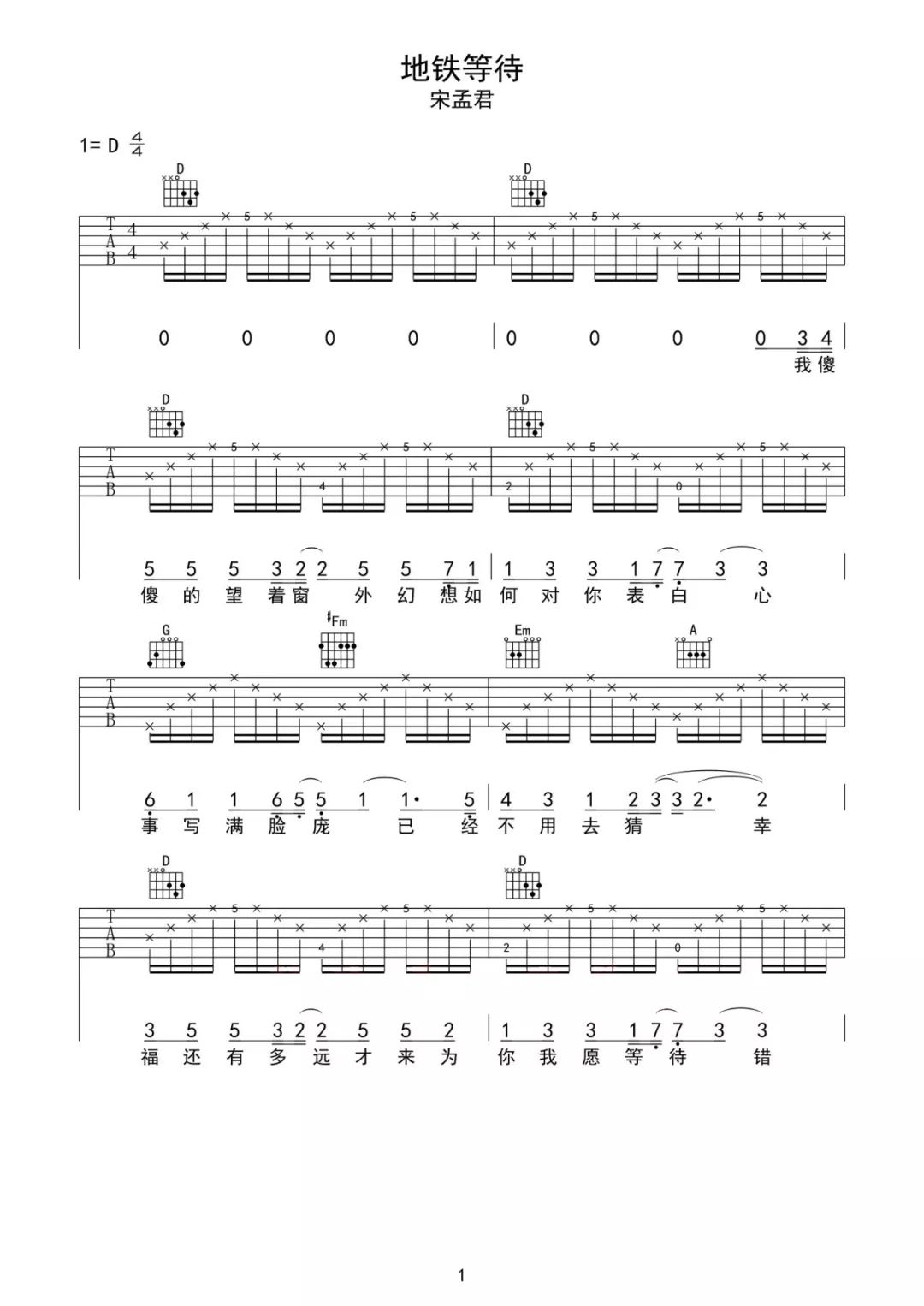 地铁等待吉他谱 - 宋孟君 - D调吉他弹唱谱