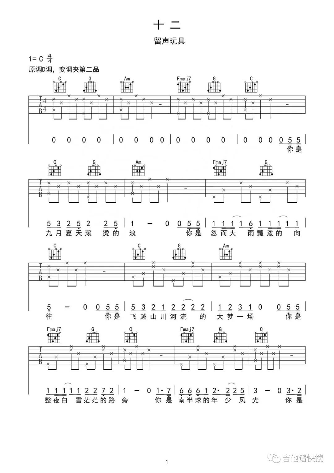 十二吉他谱 - 留声玩具 - C调吉他弹唱谱