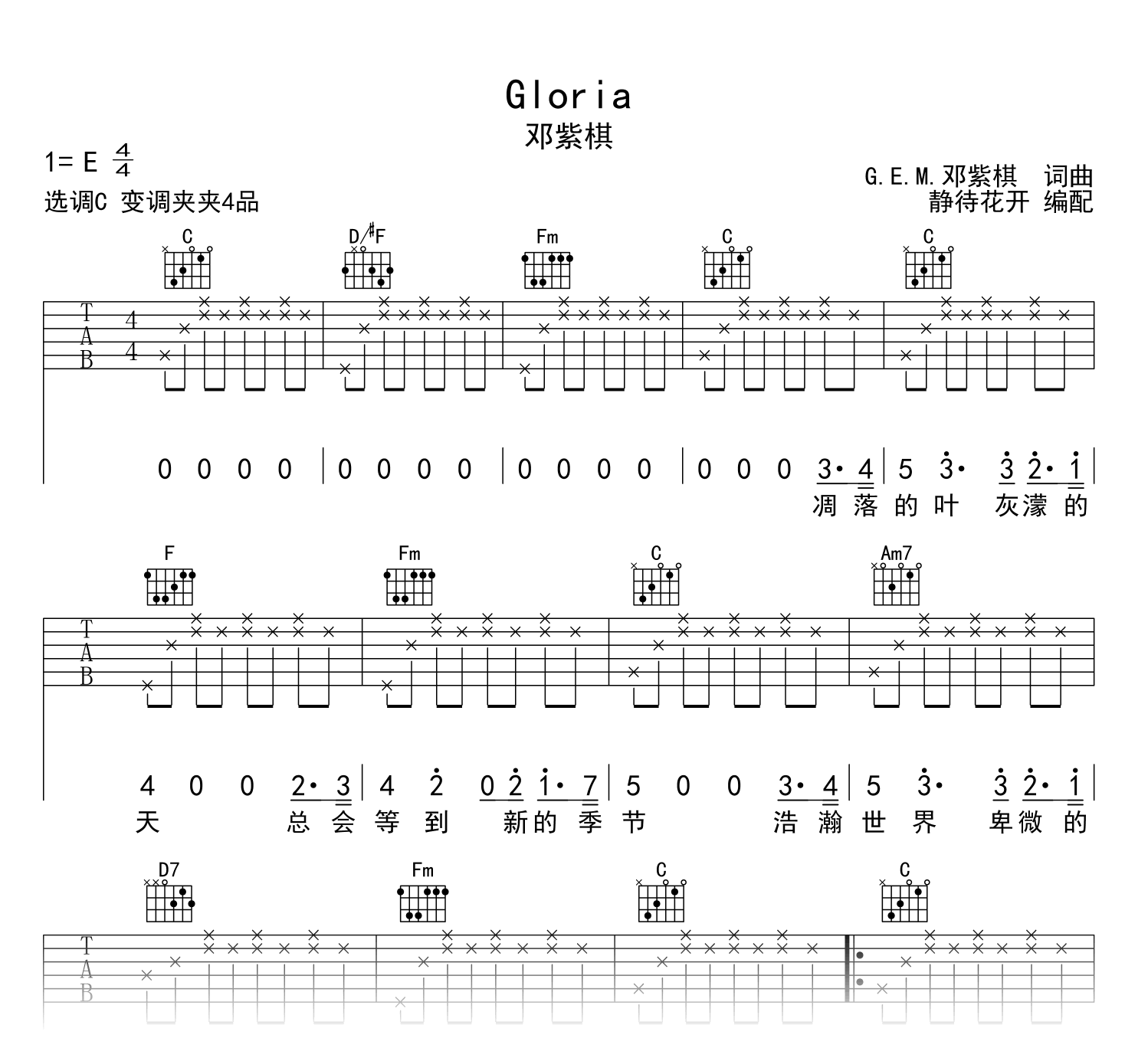 曲谱介绍: Gloria吉他谱,邓紫棋新专辑歌曲,《Gloria》吉他弹唱谱,原调E调,采用C调和弦指法编配,变调夹夹第四品,演奏的速度在每分钟86拍左右,演奏难度简单。