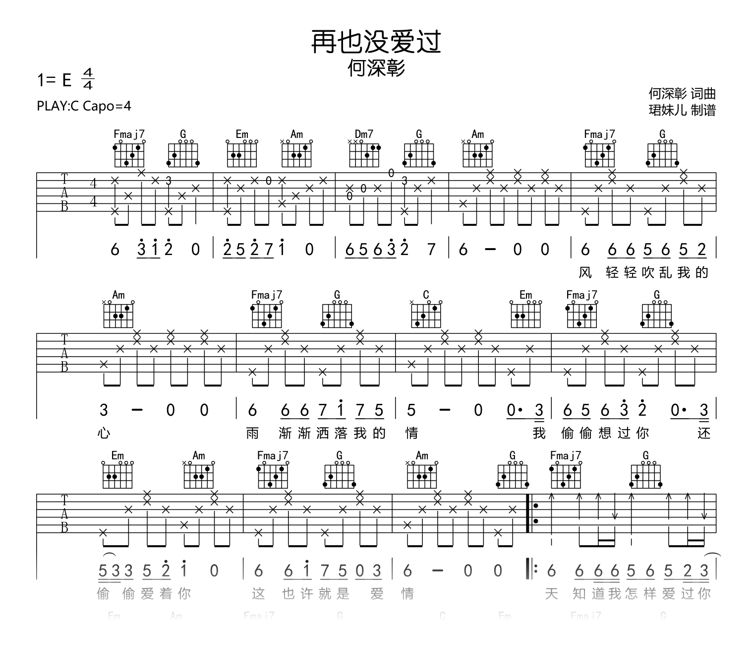 曲谱介绍: 再也没爱过吉他谱,何深彰演唱,《再也没爱过》吉他弹唱谱,原调E,选用C调指法编配,弹唱建议变调夹4品,85BPM,难度较简单演奏易上手。完整编配共两张高清图片六线谱。