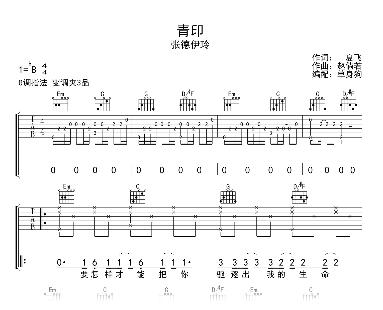 曲谱介绍: 青印吉他谱,张德伊玲演唱的一首旋律动听的古风歌曲,青印吉他弹唱谱,原调bB,选用G调指法编配,变调夹夹三品,完整六线谱共三张高清图片。