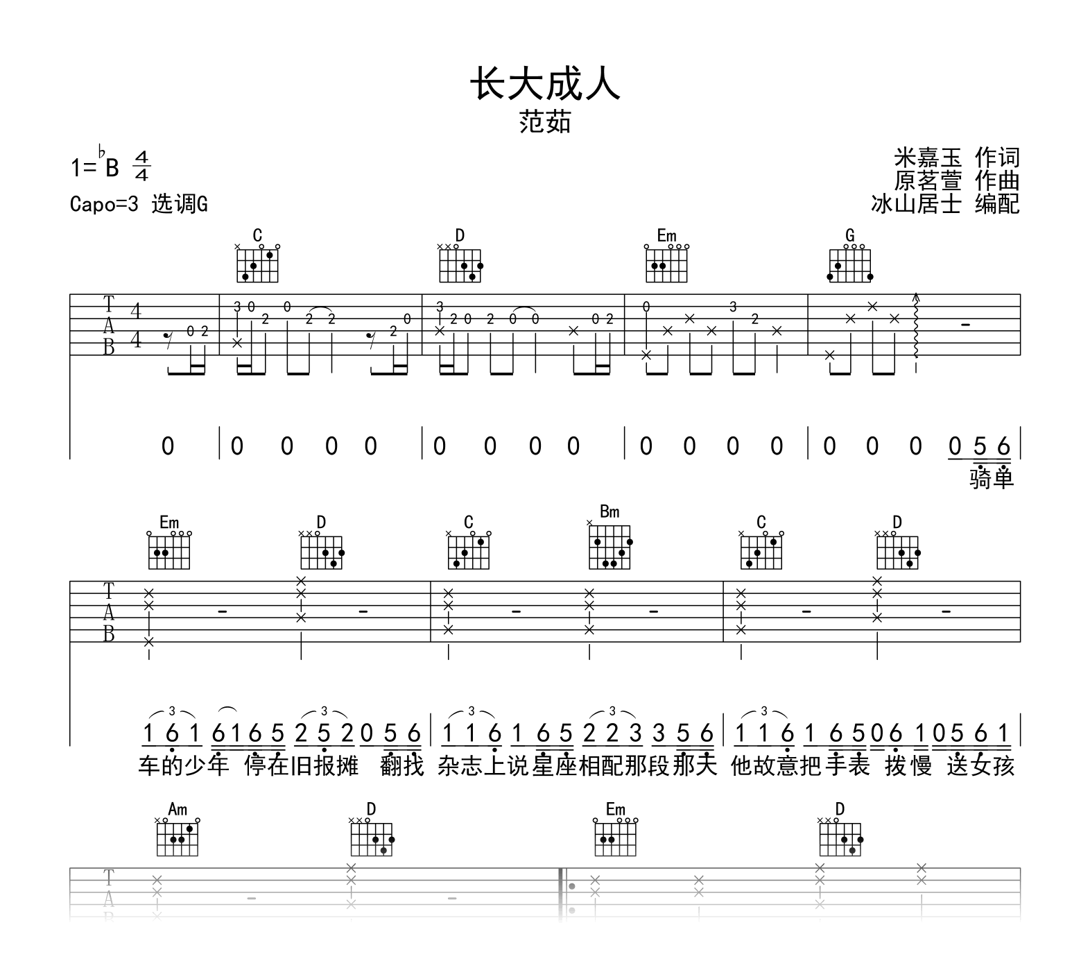 曲谱介绍: 长大成人吉他谱,范茹的一首歌曲,《长大成人》吉他弹唱谱,选用G调指法编配,原调为降B调,变调夹夹3品弹唱。完整六线谱共三张高清图片谱例。