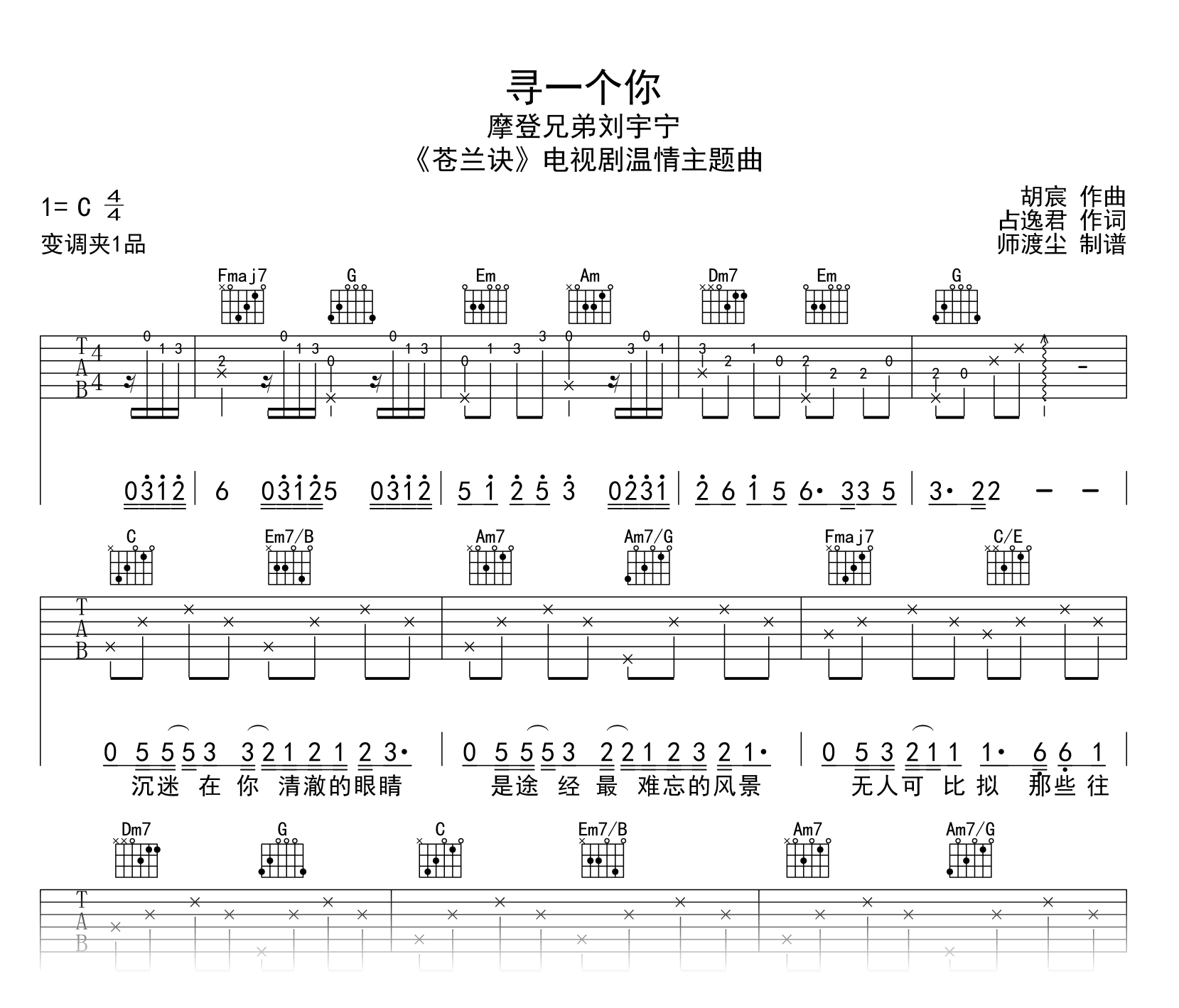曲谱介绍: 寻一个你吉他谱,刘宇宁演唱,电视剧《苍兰诀》主题曲,内敛又潇洒的国风旋律演绎一段悠远情思。《寻一个你》吉他弹唱谱,原调升C调,选用C调指法编配,变调夹夹第一品,速度在每分钟75拍左右,演奏难度一般。