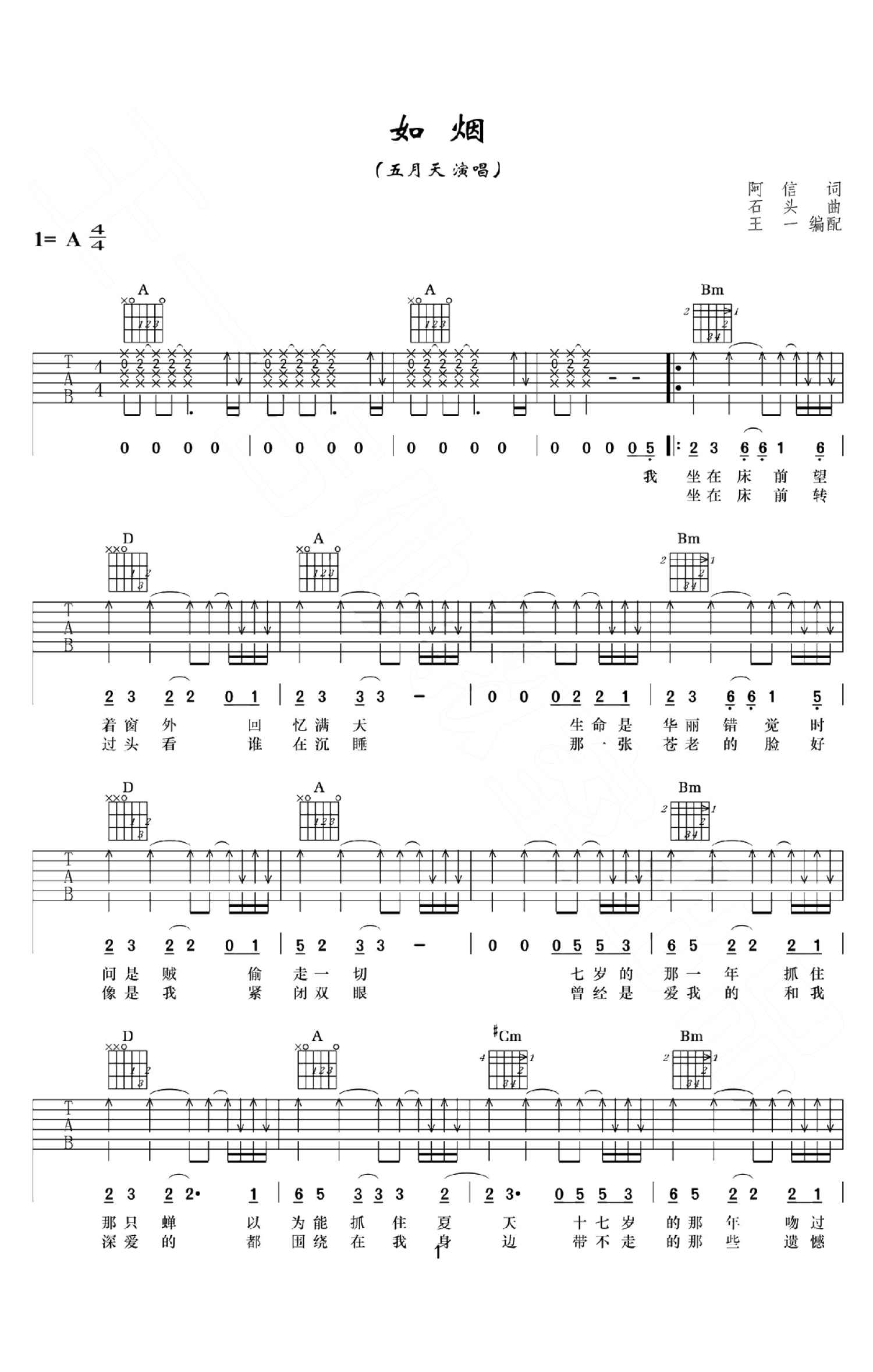 如烟吉他谱 - 五月天 - A调吉他弹唱谱