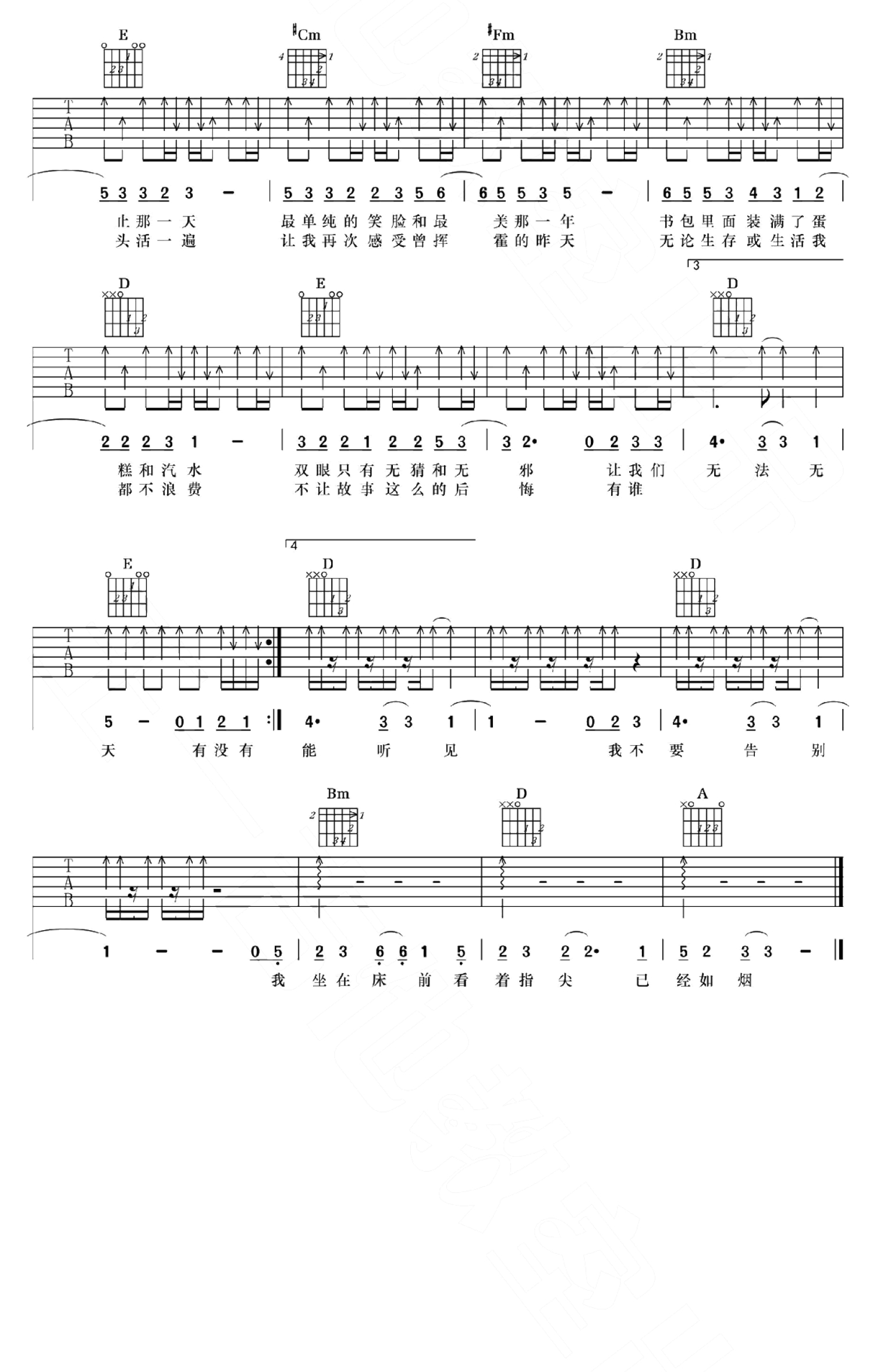 曲谱介绍: 如烟吉他谱,五月天歌曲,如烟吉他弹唱谱,A调指法编配。喜欢缓缓唱出那句”七岁的那一年,抓住那只蝉以为能抓住夏天;十七岁的那年吻过他的脸,就以为和他能永远“,仿佛能感觉到那天的阳光,那时的往事和回不去的青春。