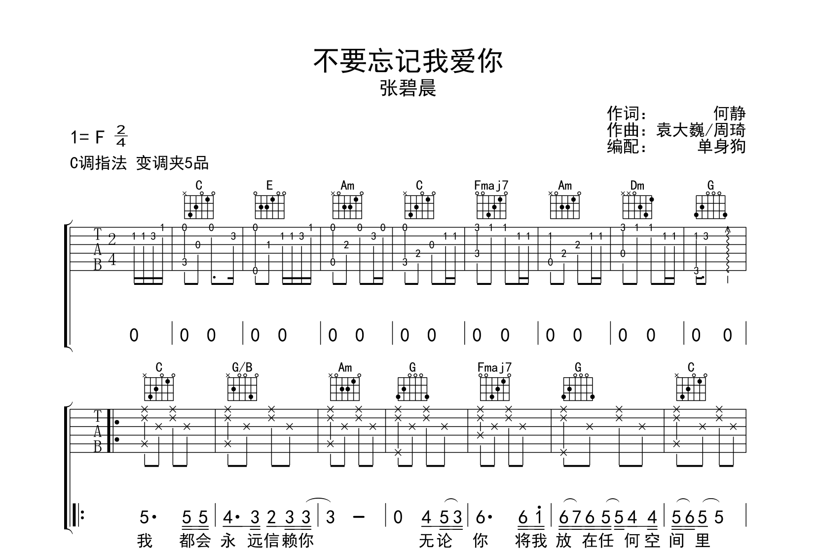 曲谱介绍: 不要忘记我爱你吉他谱,张碧晨演唱,《不要忘记我爱你》吉他弹唱谱,选用C调指法,变调夹夹5品弹唱原调,节奏2/4拍,共2张高清图片谱,难度较简单。本谱由创作者单身狗制谱分享。