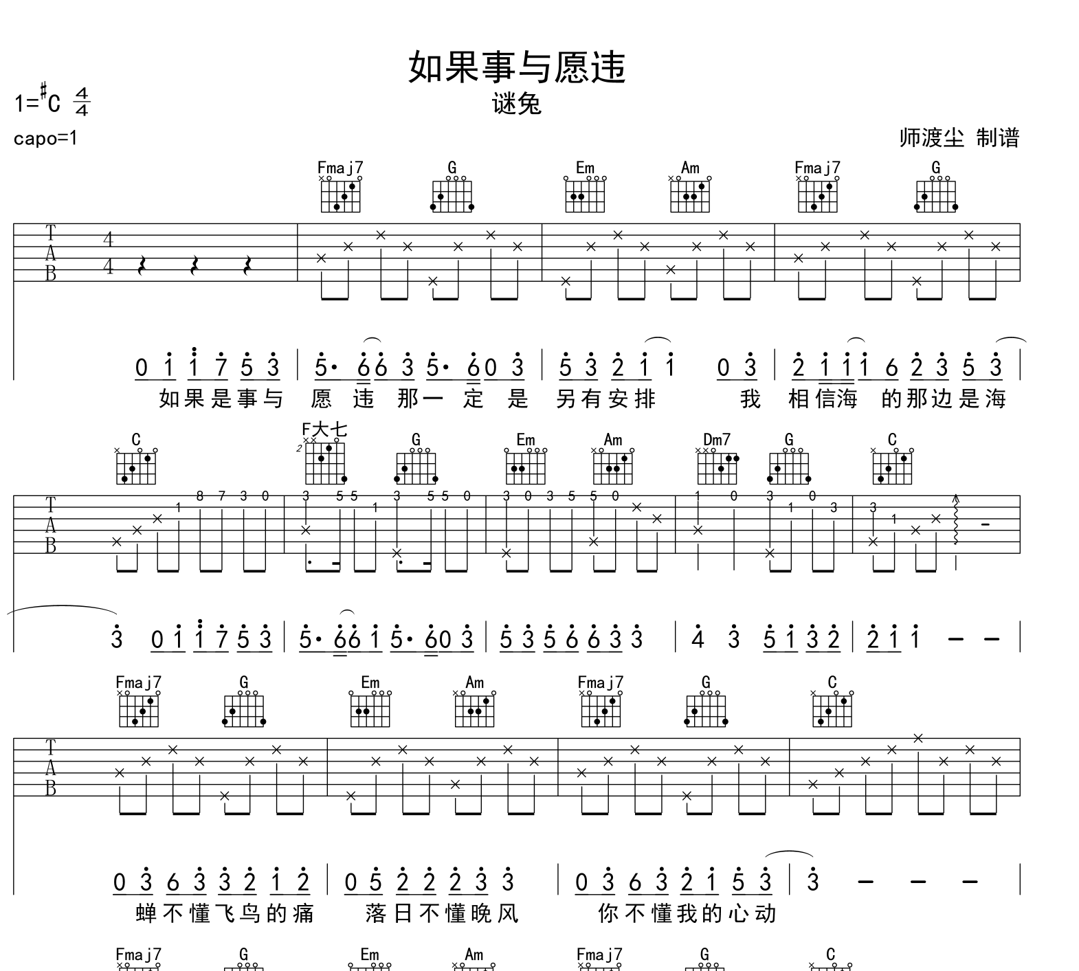 曲谱介绍: 如果事与愿违吉他谱,谜兔演唱。来自@师渡尘编配扒谱制作,本吉他谱采用C调和弦指法编配,推荐变调夹夹第1品演奏,原调#C调,也可以根据个人嗓音条件灵活选择变调夹位置,演奏的速度控制在每分钟78拍左右,演奏难度简单。 吉他弹唱预览音频: