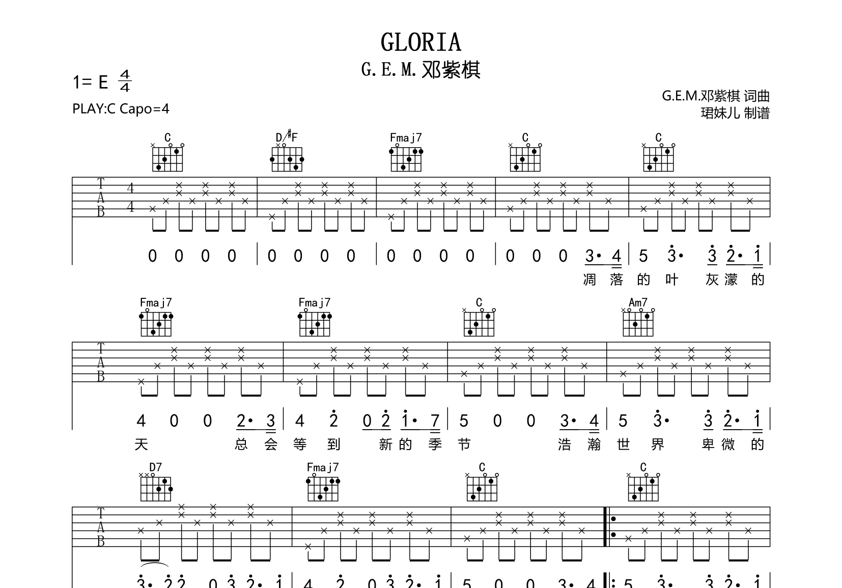 曲谱介绍: 《GLORIA》吉他谱-,邓紫棋演唱的歌曲,《GLORIA》吉他弹唱谱,共有3张高清图片谱例,本谱采用C调指法编配,弹唱建议变调夹4品,速度75BPM,节奏4/4拍,难度较简单,易上手。本谱由珺妹儿制谱分享。