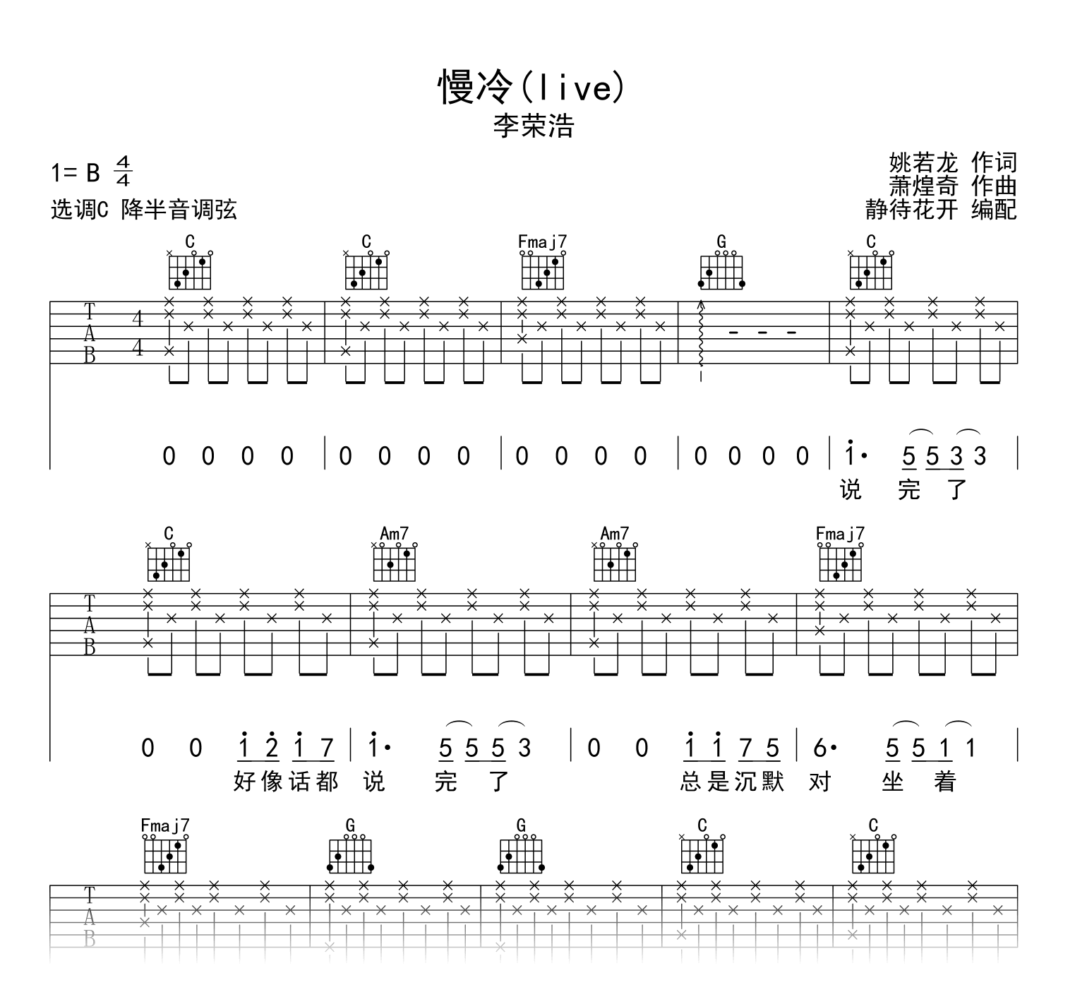 曲谱介绍: 慢冷吉他谱,李荣浩《中国好声音》现场版,翻唱梁静茹的一首歌曲。《慢冷》吉他六线谱,原调B,采用C调指法编配,降半音调弦,也可以根据个人嗓音选择变调夹位置,速度每分钟85拍左右,演奏难度简单。