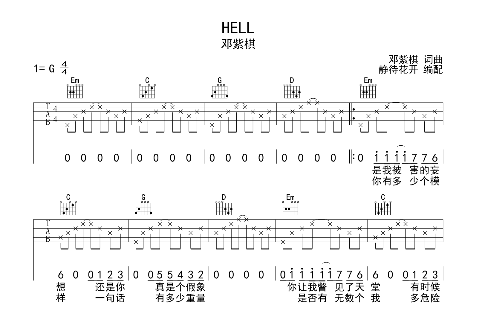 曲谱介绍: HELL吉他谱,邓紫棋演唱的歌曲,《HELL》吉他弹唱谱,来自@静待花开编配扒谱制作,本吉他谱采用G调和弦指法编配,演奏不夹变调夹,原调G调,也可以根据个人嗓音条件灵活选择变调夹位置,演奏的速度控制在每分钟90拍左右,演奏难度简单。
