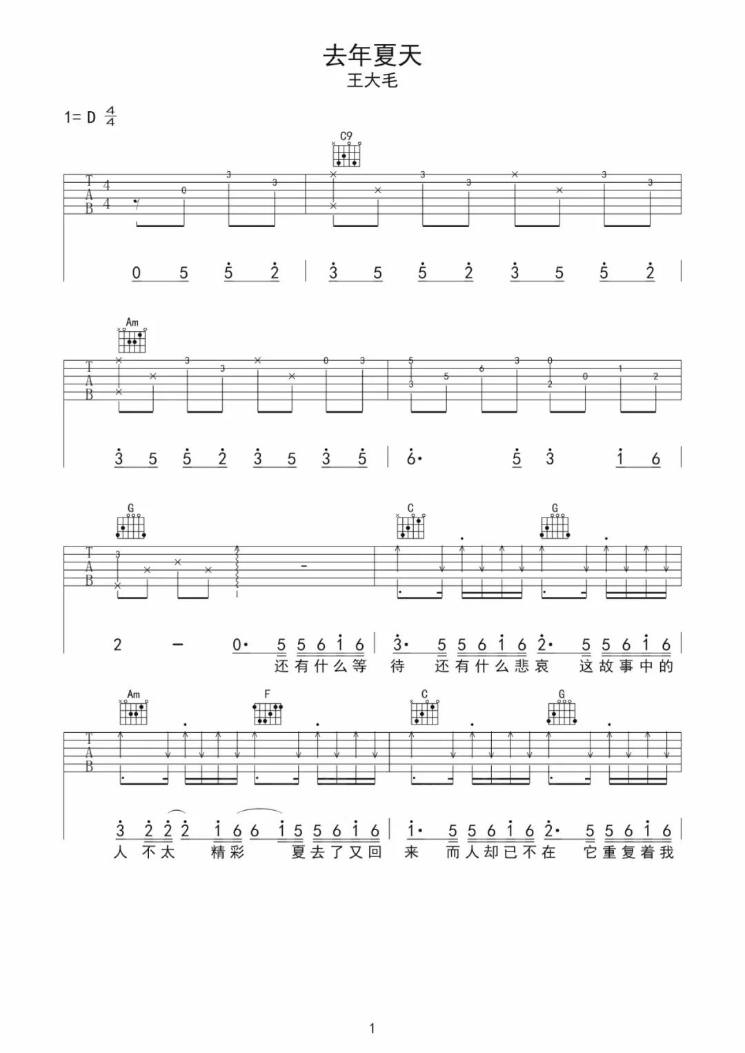 去年夏天吉他谱 - 王大毛 - D调吉他弹唱谱