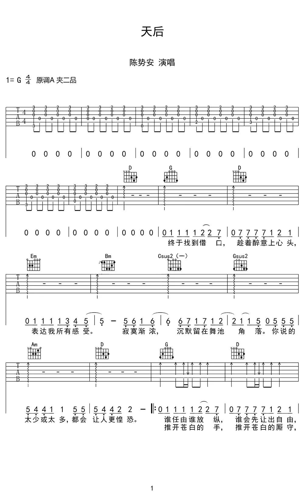 天后吉他谱 - 陈势安 - G调吉他弹唱谱