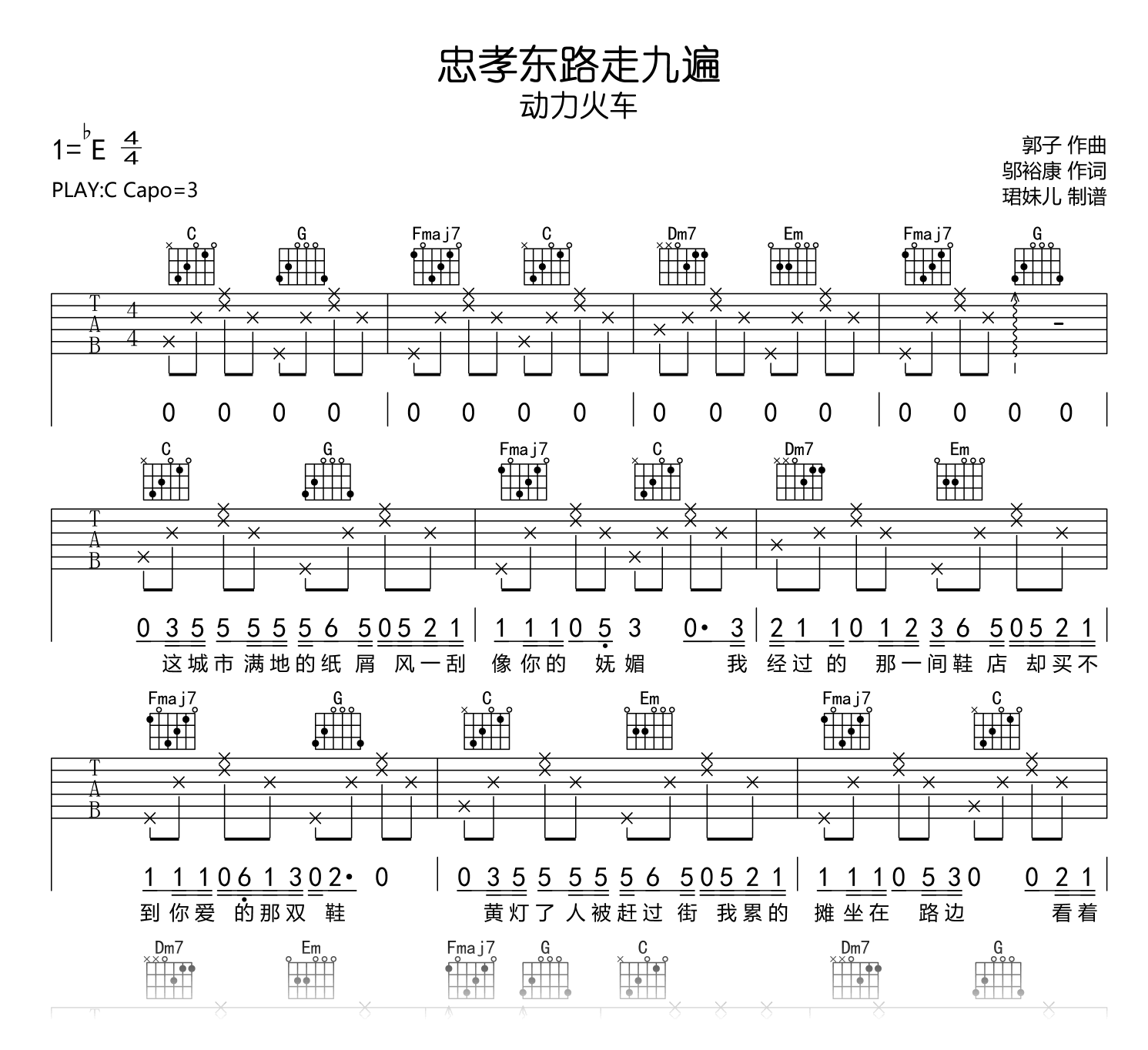 曲谱介绍: 忠孝东路走九遍吉他谱,动力火车演唱,这首歌让无数人记住了台北的忠孝东路。那里除了有美食,还是一个见证失恋的伤心地。 《忠孝东路走九遍》吉他弹唱谱,原调降E,采用C调指法编配,Capo建议夹3品,速度85BPM,演奏难度较简单易上手。完整六线谱共两张高清图例。