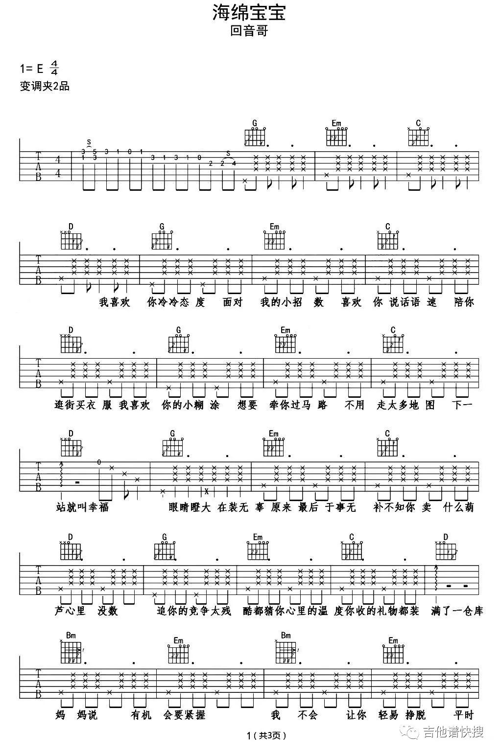 海绵宝宝吉他谱 - 影视动画 - E调吉他弹唱谱