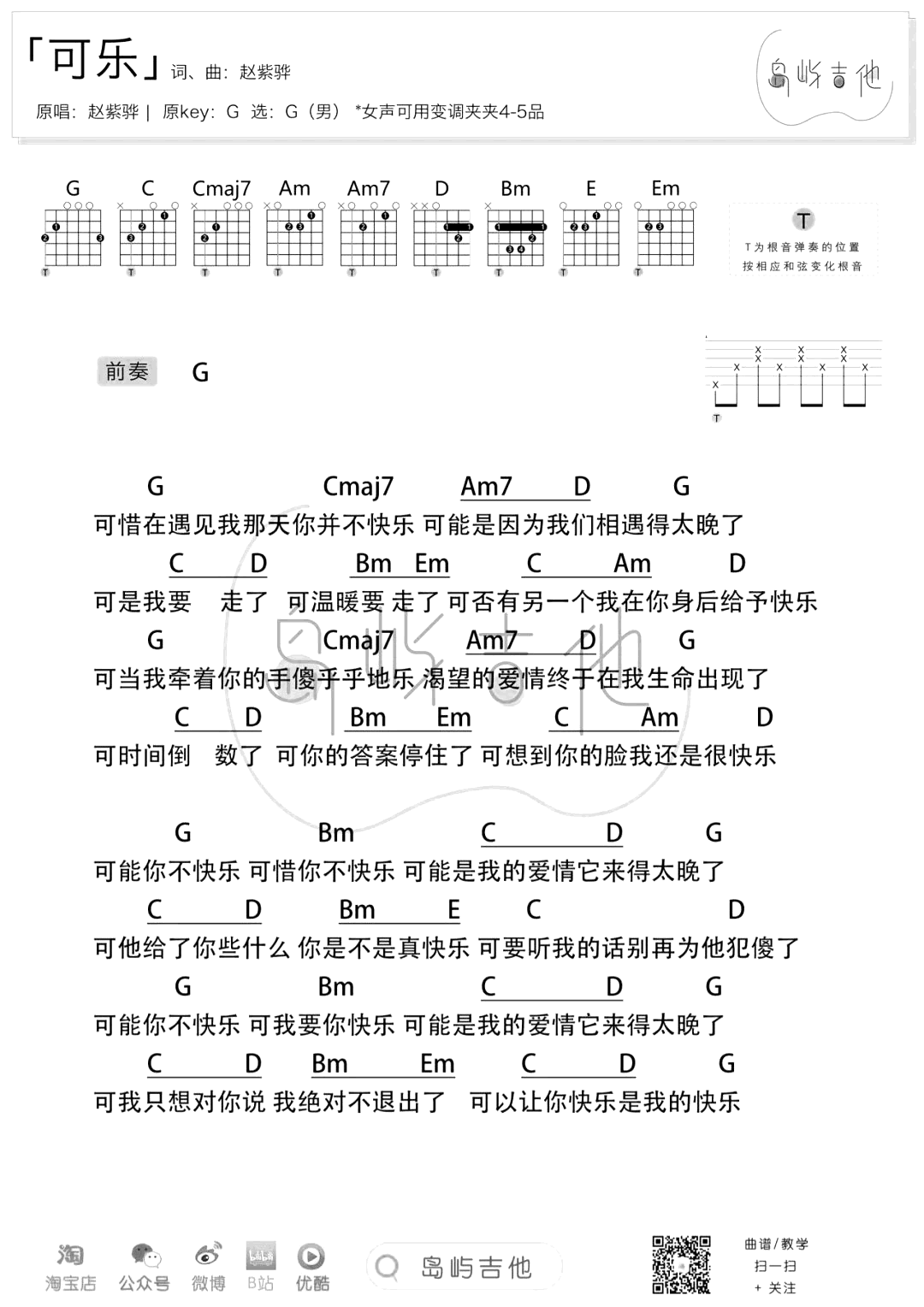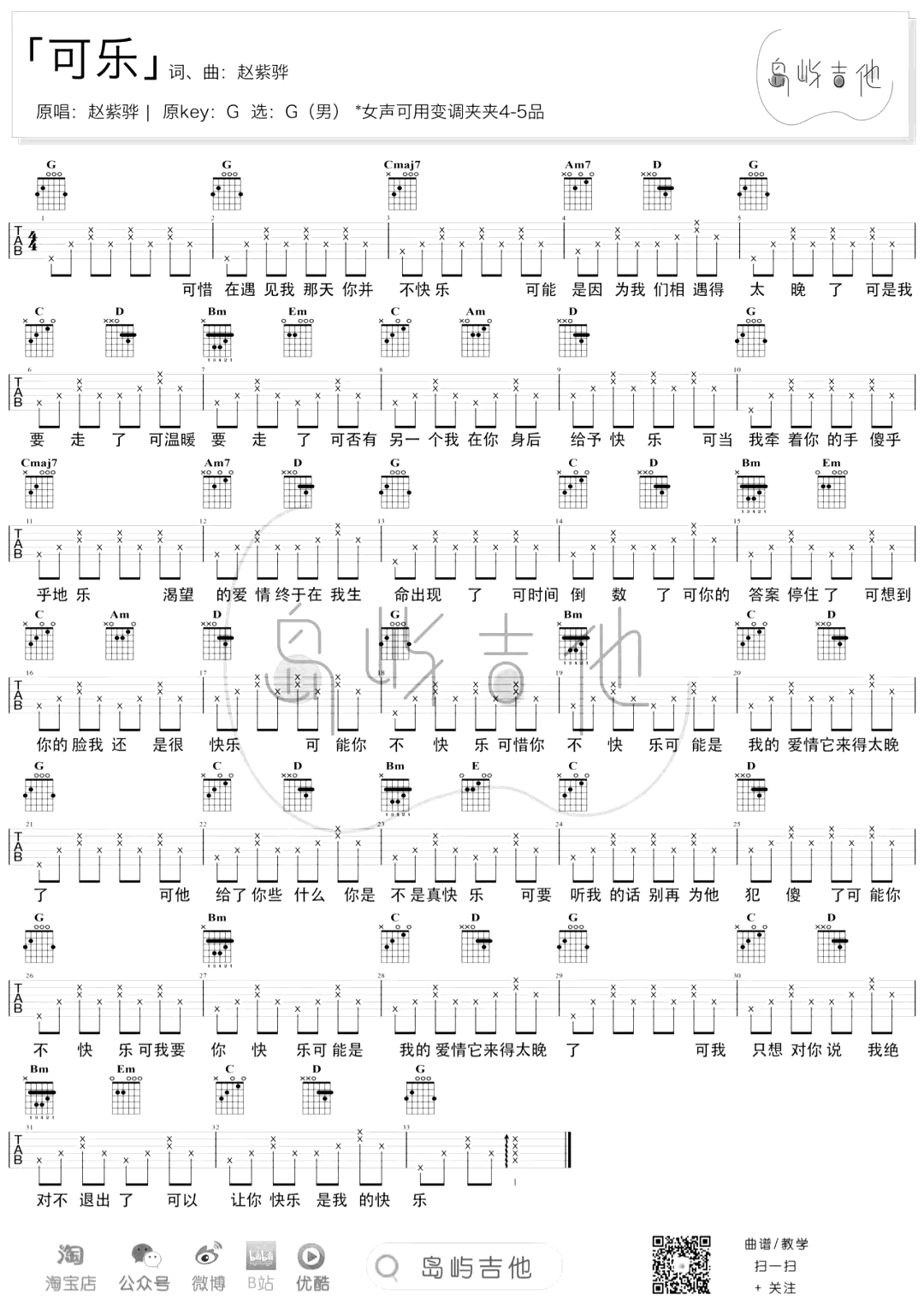 曲谱介绍: 可乐吉他谱,赵紫骅创作演唱的一首很好听的悲情歌,悲伤的情绪随着缓缓的旋律袭来,满耳朵的“可惜 可能 快乐 不快乐”,听完直接emo住了! 《可乐》吉他弹唱谱,选用G调指法编配,女生可以用变调夹夹四品。随谱附上《可乐》吉他弹唱教学视频,琴友们可以跟随尼克猫老师的示范讲解练习起来。