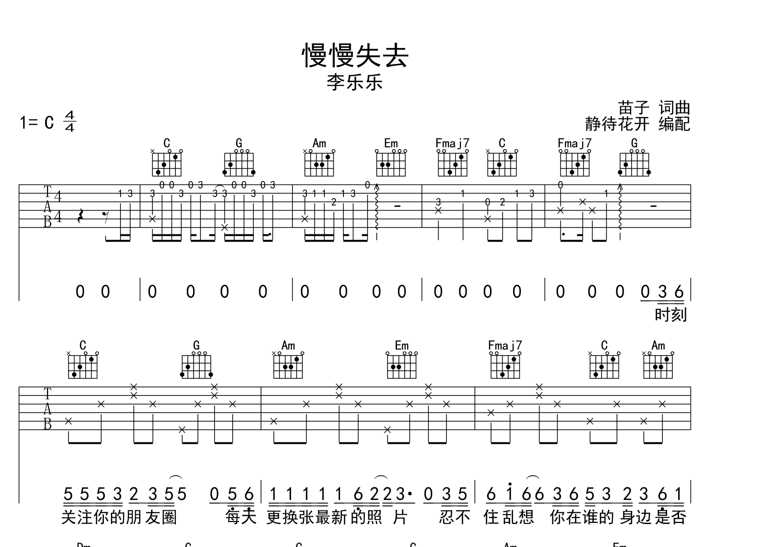 曲谱介绍: 《慢慢失去》吉他谱,李乐乐演唱,《慢慢失去》吉他弹唱谱,来自@静待花开编配扒谱制作,本吉他谱采用C调和弦指法编配,演奏不夹变调夹,原调C调,也可以根据个人嗓音条件灵活选择变调夹位置,演奏的速度控制在每分钟80拍左右,演奏难度简单。