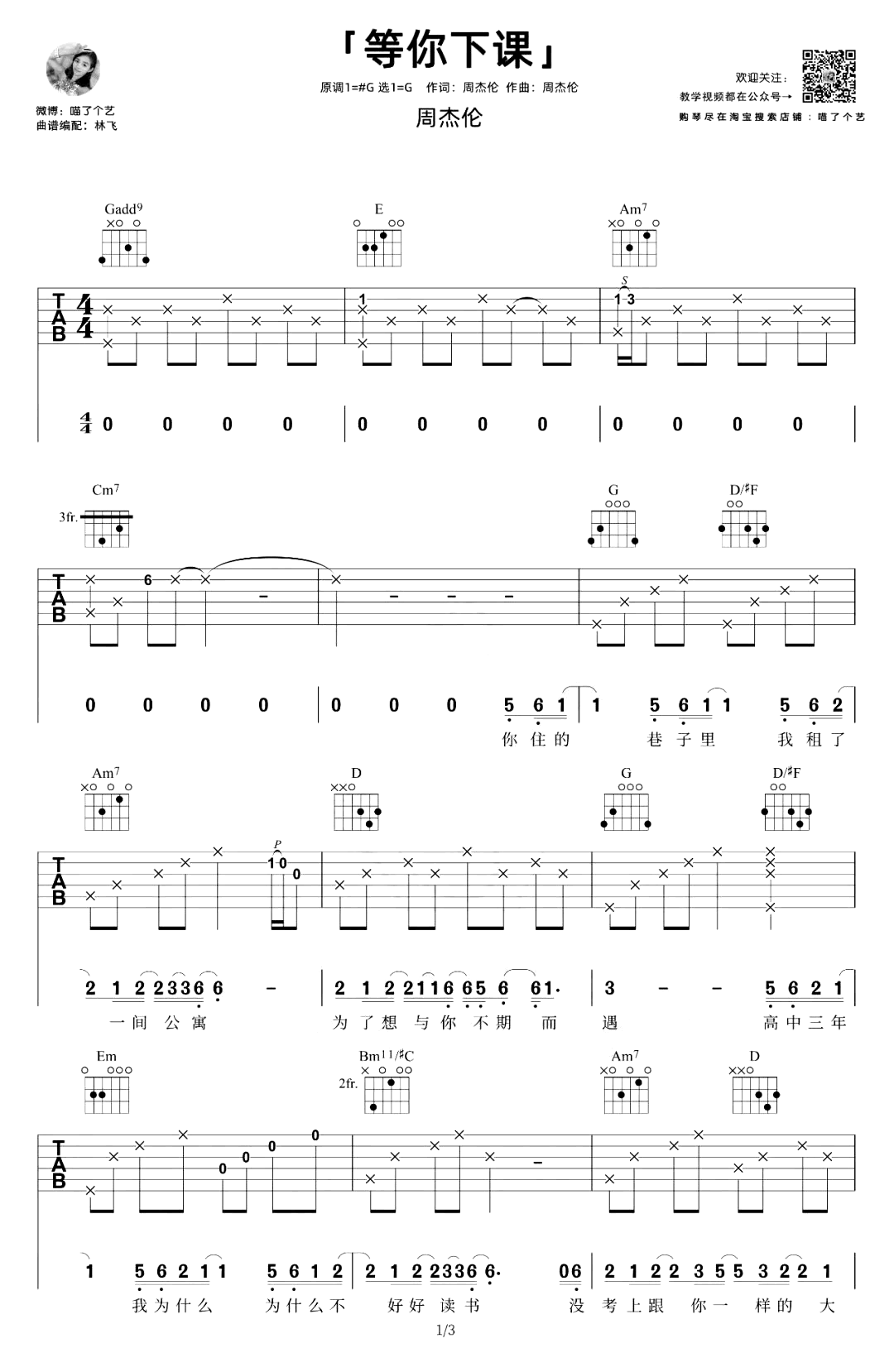 曲谱介绍: 吉他教学视频 等你下课吉他谱,周杰伦的经典校园浪漫情歌。《等你下课》吉他弹唱谱,原调升G选调G,三张图片六线谱。随谱附上吉他弹唱演示和教学视频,琴友们跟随老师带来的吉他示范讲解练习起来。 等你下课是一首很耐听、不知不觉会循环的歌,词很真诚,旋律好听。这次林老师的吉他谱有不少细微的惊喜,推荐大家弹看看。