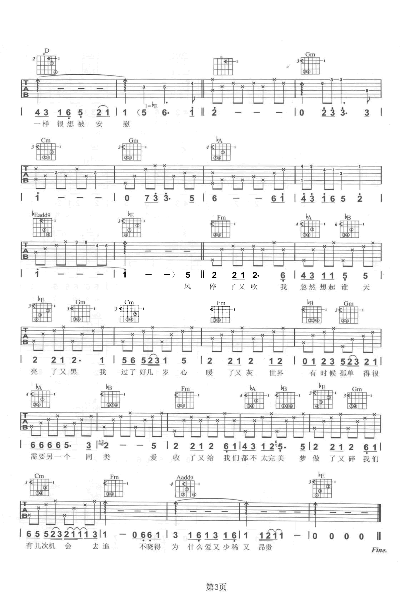 曲谱介绍: 同类吉他谱,孙燕姿的一首老歌,唱出我们每个人都是孤独个体存在的无奈。《同类》吉他弹唱谱,选用原调D转bE调编配,不用变调夹,六线谱共三张图片谱例。