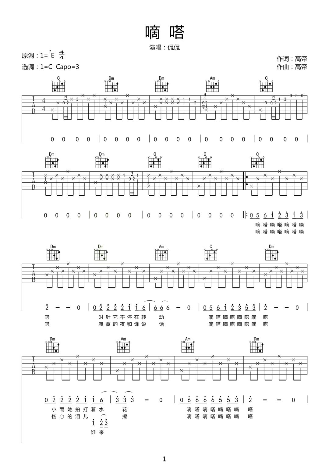 嘀嗒吉他谱 - 侃侃 - C调吉他弹唱谱