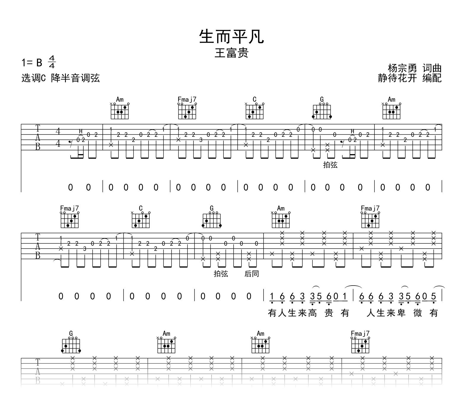 曲谱介绍: 生而平凡吉他谱,王富贵演唱。《生而平凡》吉他弹唱吉他谱,原调B调,采用C调和弦指法编配,建议降半音调弦,也可依个人音域灵活选择变调夹位置,速度每分钟85拍左右,演奏难度简单。