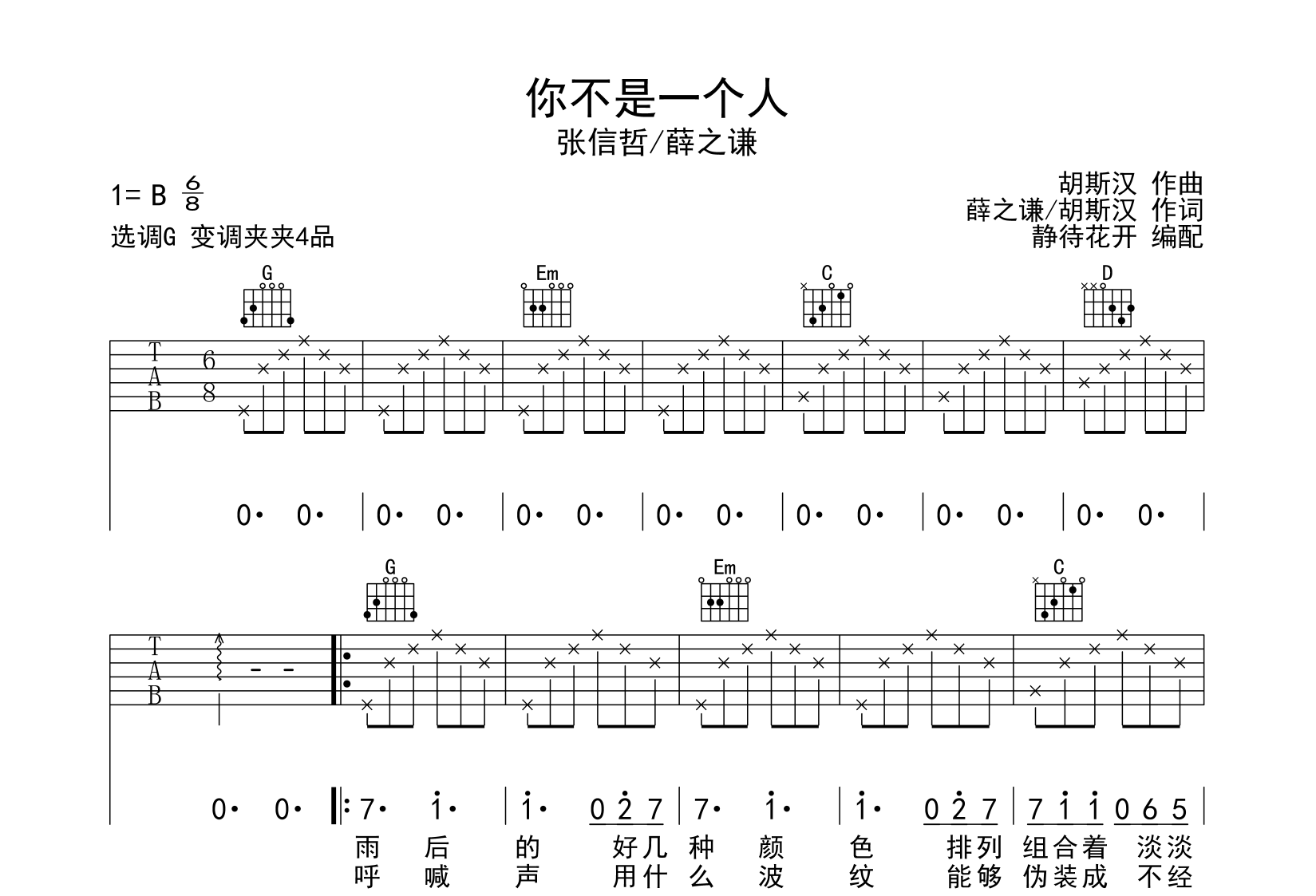 曲谱介绍: 你不是一个人吉他谱,张信哲和薛之谦演唱,《你不是一个人》吉他弹唱谱,来自@静待花开编配扒谱制作,本吉他谱采用G调和弦指法编配,推荐变调夹夹第4品演奏,原调B转C调,未做转调处理,也可以根据个人嗓音条件灵活选择变调夹位置,演奏的速度控制在每分钟80拍左右,演奏难度简单。