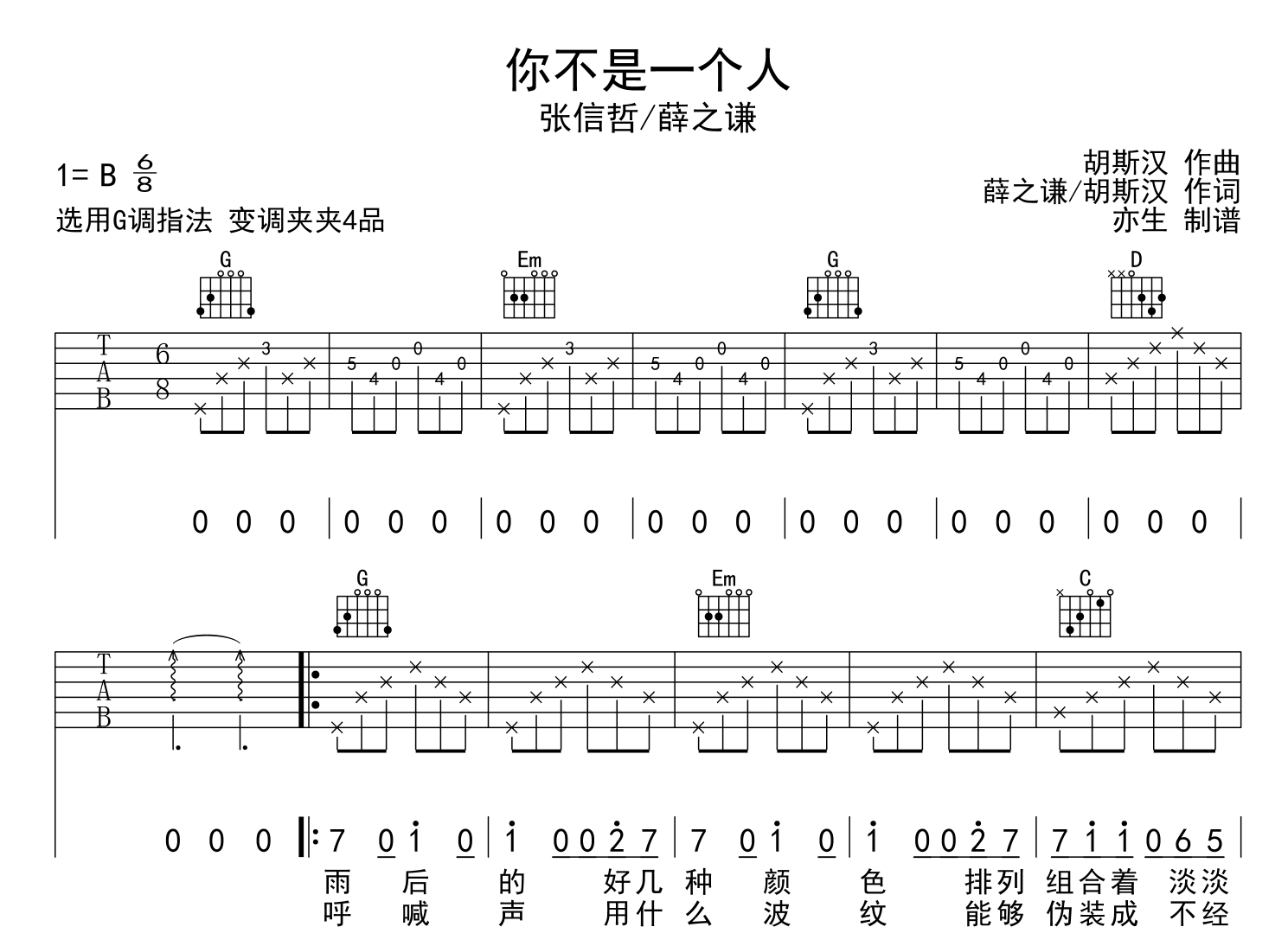 曲谱介绍: 《你不是一个人》吉他谱,张信哲/薛之谦演唱,《你不是一个人》吉他弹唱谱,本吉他谱采用G调指法,节奏6/8拍,速度95,变调夹夹4品,难度简单,由亦生制谱分享,共有3张高清图片谱例。