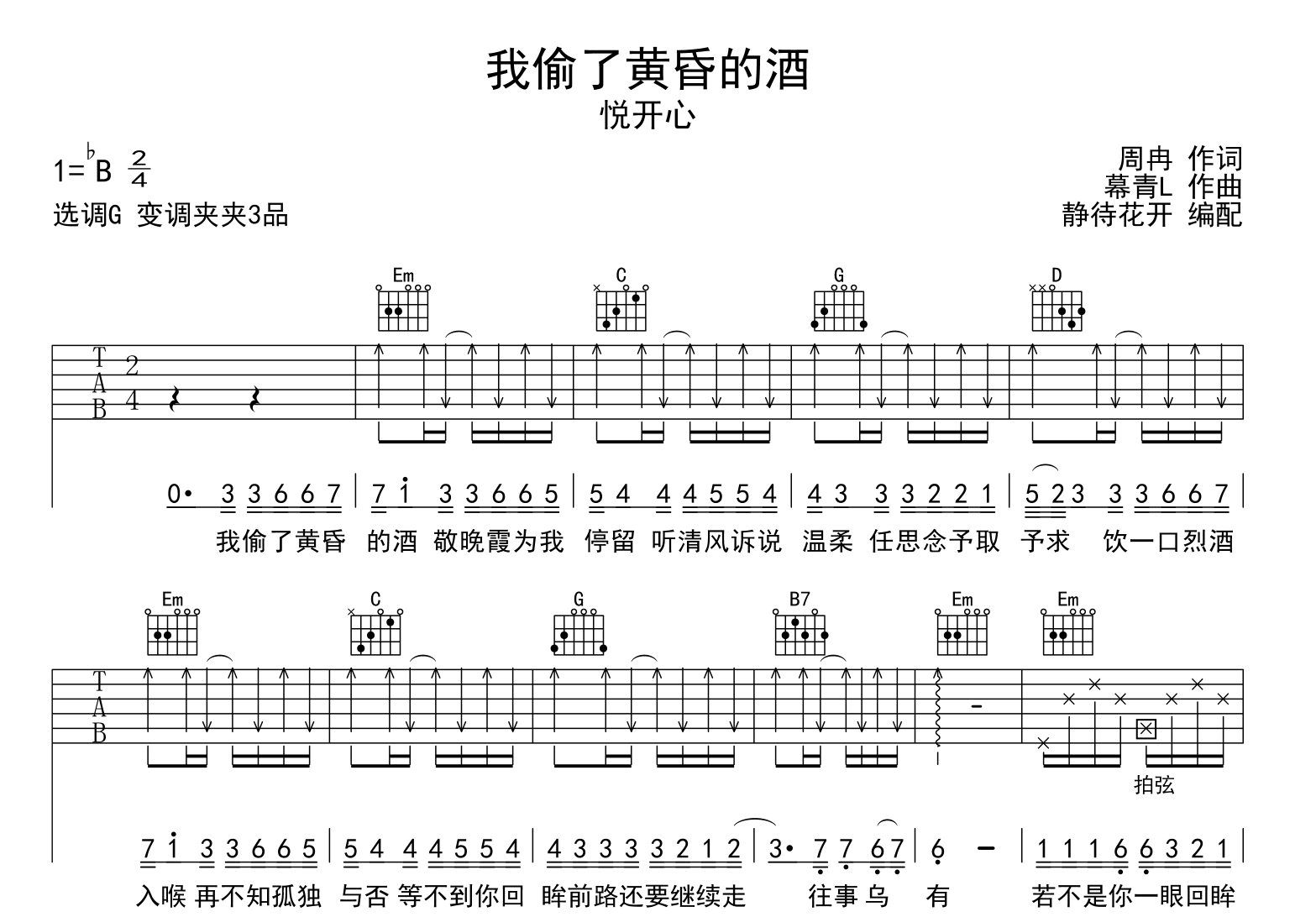 曲谱介绍: 《我偷了黄昏的酒》吉他谱,悦开心演唱,《我偷了黄昏的酒》吉他弹唱谱,来自@静待花开编配扒谱制作,本吉他谱采用G调和弦指法编配,推荐变调夹夹第3品演奏,原调bB调,也可以根据个人嗓音条件灵活选择变调夹位置,演奏的速度控制在每分钟85拍左右,演奏难度简单