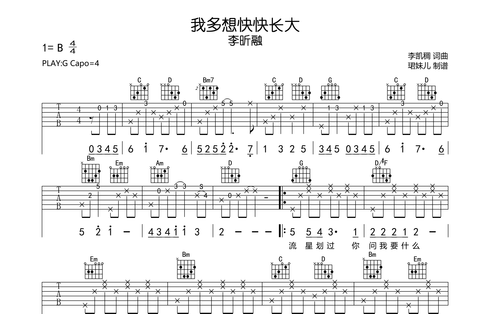 曲谱介绍: 《我多想快快长大》吉他谱,李昕融演唱,《我多想快快长大》吉他弹唱谱,本谱采用G调指法编配,弹唱建议变调夹4品,速度85BPM难度较简单,易上手,本谱由珺妹儿制谱分享,共有2张高清图片谱例。