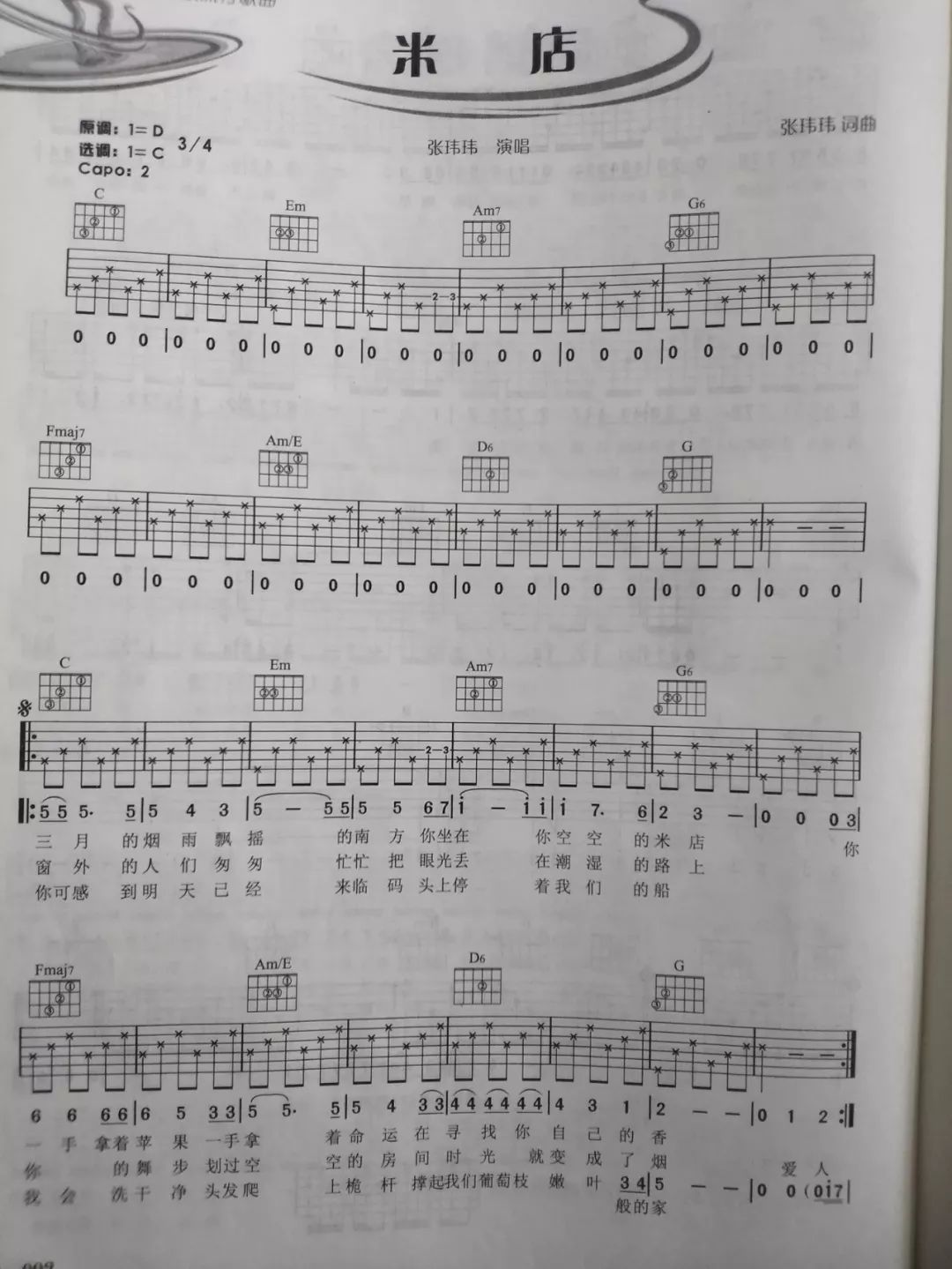曲谱介绍: 《米店》是张玮玮作词、作曲,并演唱的一首民谣歌曲,收录于专辑《白银饭店》。张玮玮,1976年出生于中国甘肃省白银市,中国内地创作型民谣男歌手,河乐队成员。