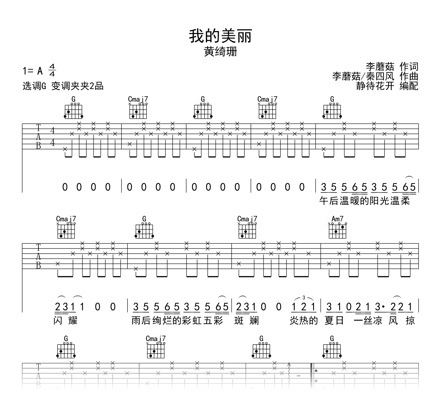 曲谱介绍: 我的美丽吉他谱,黄绮珊直率诚恳的情感表露,唱自己走过的人生故事,引起广泛的共鸣。《我的美丽》吉他弹唱谱,采用G调和弦指法编配,变调夹夹第2品,速度每分钟70拍左右,演奏难度简单。