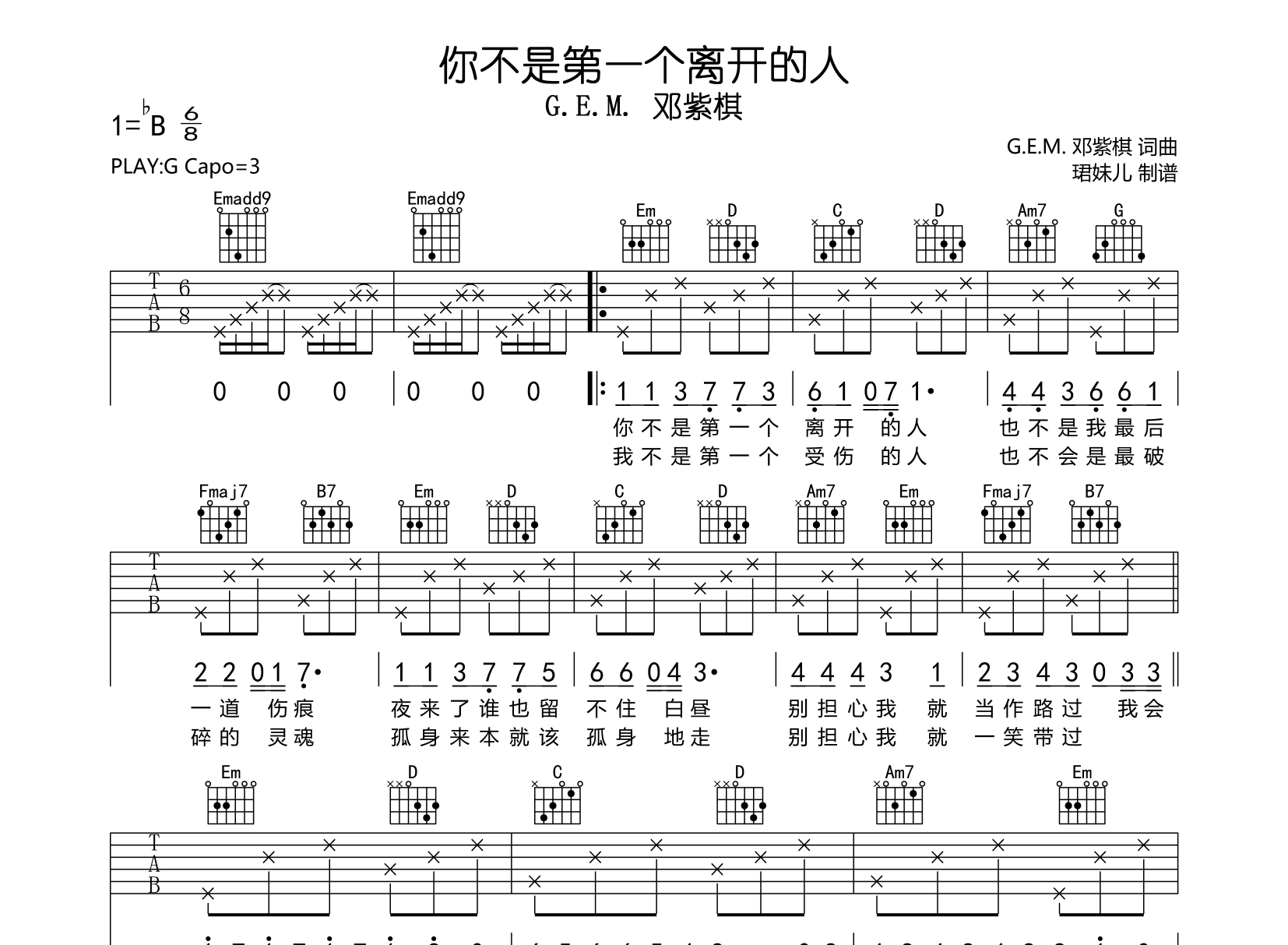 曲谱介绍: 你不是第一个离开的人吉他谱,邓紫棋演唱,《你不是第一个离开的人》吉他弹唱谱,本谱采用G调指法编配,弹唱建议变调夹3品,速度85BPM,节奏6/8拍,难度较简单,易上手,共有2张高清图片谱,由珺妹儿制谱分享。