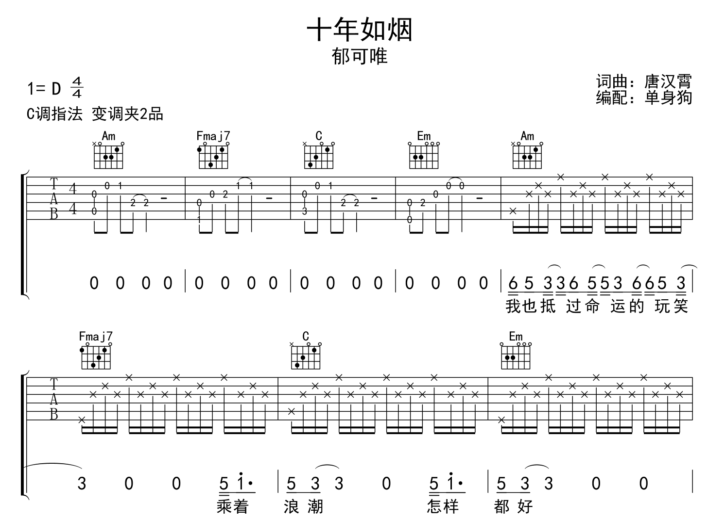 曲谱介绍: 《十年如烟》吉他谱,郁可唯演唱《十年一品温如言》电影主题曲,《十年如烟》吉他弹唱谱,来自@单身狗编配扒谱制作,本吉他谱采用C调和弦指法编配,推荐变调夹夹第2品演奏,原调D调,也可以根据个人嗓音条件灵活选择变调夹位置,演奏难度简单,共有4张高清六线谱图例。