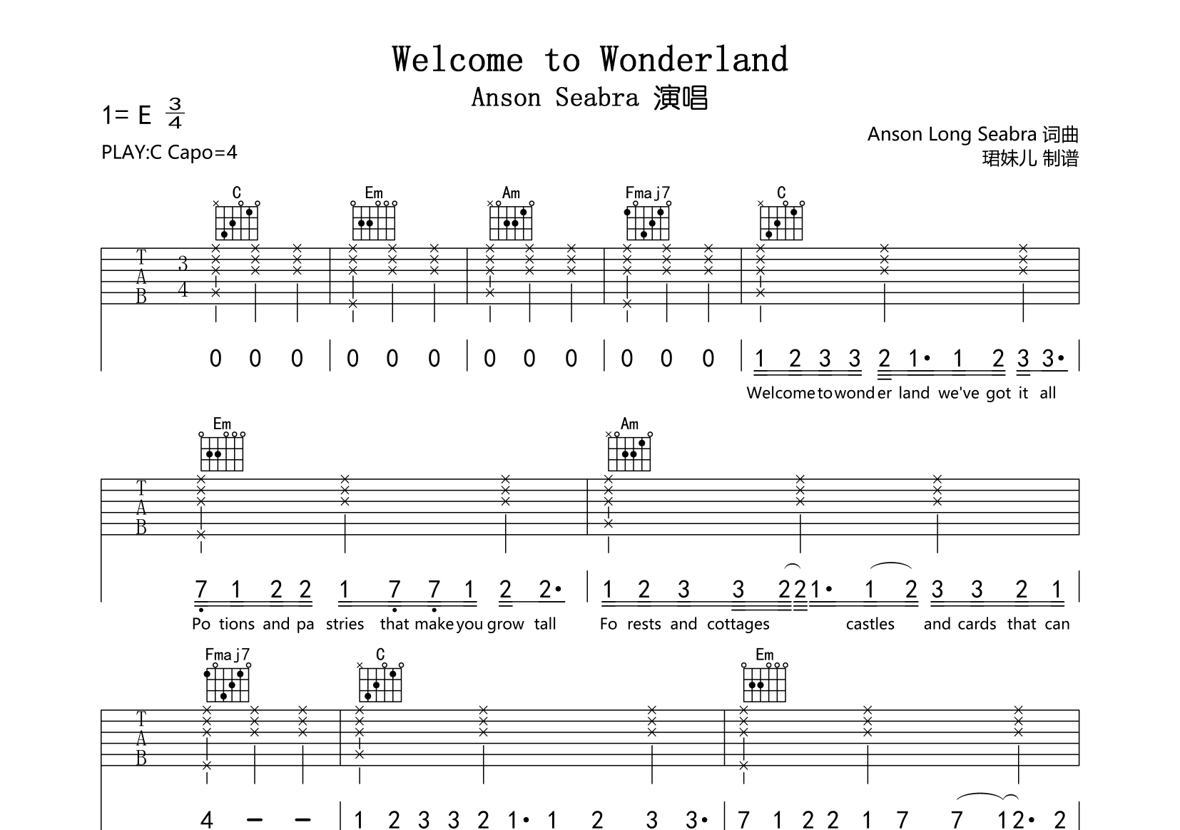 曲谱介绍: Welcome to Wonderland吉他谱,本谱采用C调指法编配,弹唱建议变调夹4品,Welcome to Wonderland吉他弹唱谱,速度55BPM,节奏3/4拍,难度较简单,易上手,共有3张高清图片谱,由珺妹儿制谱。