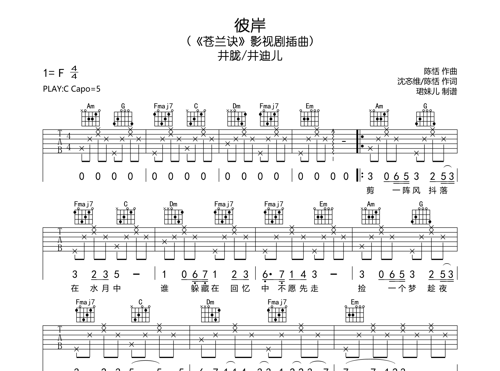 曲谱介绍: 彼岸吉他谱 (《苍兰诀》影视剧插曲) , 彼岸吉他弹唱谱,本谱采用C调指法编配,,弹唱建议变调夹5品,速度85BPM,节奏4/4拍,难度较简单,易上手,由珺妹儿制谱,共有2张高清图片谱。