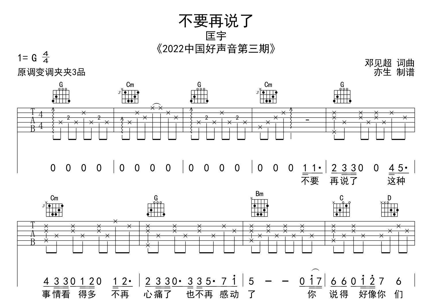 曲谱介绍: 不要再说了吉他谱,匡宇演唱,《不要再说了》吉他弹唱谱,采用G调指法,原调bB调,节奏4/4拍,速度95BPM,变调夹夹3品,难度简单,共两张图片谱,由亦生制谱分享。