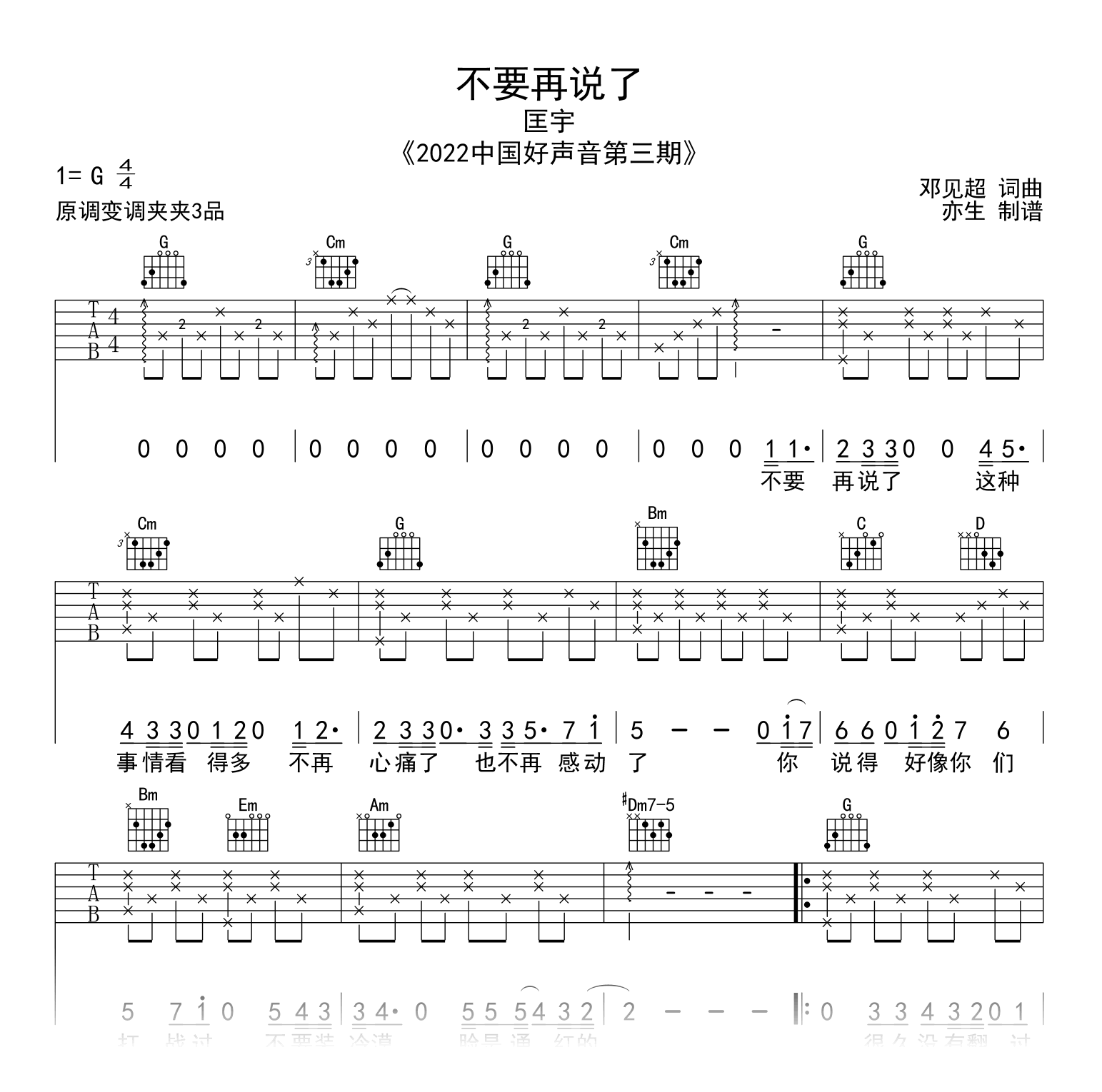 曲谱介绍: 不要再说了吉他谱,匡宇《中国好声音》节目演唱,《不要再说了》吉他弹唱谱,选用G调指法,节奏4/4拍,速度95,变调夹夹3品,难度简单,完整编配共两张图片谱例。 温柔细腻感人至深的歌声,似乎是在对自我们倾诉心声,兼具了乐感、质感和音色,这段演绎让李荣浩最快转身,相信你也绝对会爱!