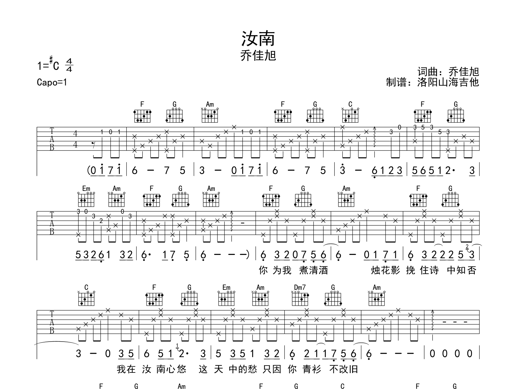 曲谱介绍: 《汝南》吉他谱,乔佳旭演唱,《汝南》吉他弹唱谱,选用C调指法,原调#C,CAPO夹1品弹唱原调,本吉他谱共有2张高清图片谱,由洛阳山海吉他制谱分享。
